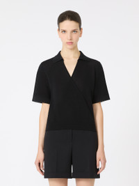 DETAILS Short-sleeved jumper, featuring a relaxed silhouette with wrap-over panels on the front. Jumper in cotton blend yarn in an interlock stitch knit Boxy line tapered towards the hem Polo collar with open V-neck COMPOSITION AND CARE 82% cotton, 18% polyamide. Hand wash cold (40°c max); do not bleach; do not tumble dry; flat drying in the shade; cool iron; professionally dry clean perchloroethylene - mild process; do not wet clean.; iron with a cloth between.; using neutral detergent. Distributed by Max Mara S.r.l., registered office in Reggio Emilia (Italy), Via Giulia Maramotti 4, 42124 (IT)