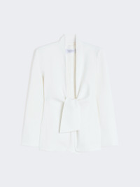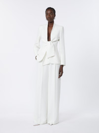 DETAILS Jacket with a feminine silhouette and sashes that tie at the front to highlight the waist. - Compact cady jacket - Mandarin collar - Set-in sleeves with high slit at the cuffs - Knotted fastening at the waist - Embellished with a tailored pick stitch - Lining customised with Monogram jacquard COMPOSITION AND CARE Fabric 65% triacetate, 35% polyester; lining 65% acetate, 35% polyester. Do not wash; do not bleach; do not tumble dry; cool iron; professionally dry clean perchloroethylene - mild process; do not wet clean. Distributed by Max Mara S.r.l., registered office in Reggio Emilia (Italy), Via Giulia Maramotti 4, 42124 (IT)