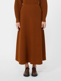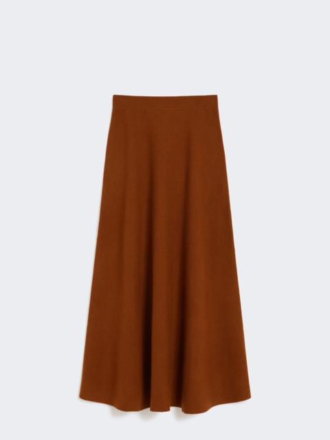 DETAILS Long skirt featuring a fabric-stitch knit that creates a substantial texture. Wool and cashmere yarn skirt Flared Elasticated ribbed waist Logo plate on the waist back COMPOSITION AND CARE 70% wool, 30% cashmere. Hand wash cold (40°c max); do not bleach; do not tumble dry; flat drying in the shade; cool iron; professionally dry clean perchloroethylene - mild process; do not wet clean.; iron with a cloth between.; using neutral detergent. Distributed by Max Mara S.r.l., registered office in Reggio Emilia (Italy), Via Giulia Maramotti 4, 42124 (IT)