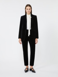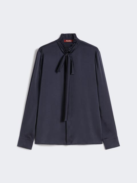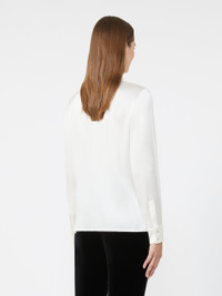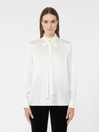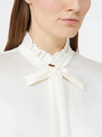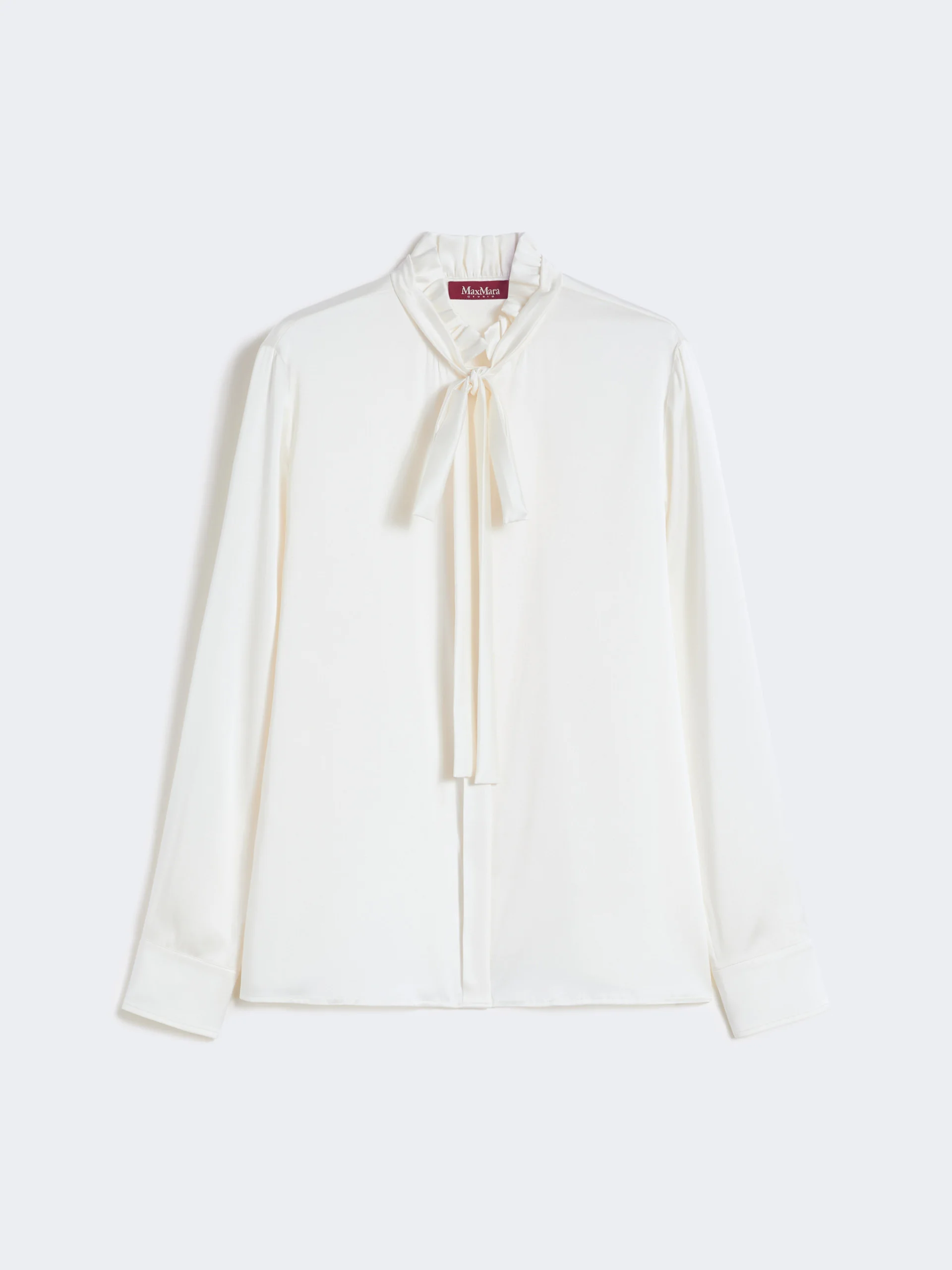 DETAILS A feminine blouse crafted from luxurious silk satin, featuring a refined ruched collar. The design is further enhanced with decorative ruffles and front ties that can be fastened into a bow. Blouse in silk satin Straight and fluid silhouette Ruched collar Long set-in sleeves Concealed front fastening Long cuffs with double-button detail COMPOSITION AND CARE 93% silk, 7% elastane. Hand wash cold (40°c max); do not bleach; do not tumble dry; line drying in the shade; cool iron; professionally dry clean perchloroethylene - mild process; do not wet clean.; wash the garment while it is fastened.; turn the articles inside out before washing.; iron with a cloth between.; contains non-textile parts of animal origin. Distributed by Max Mara S.r.l., registered office in Reggio Emilia (Italy), Via Giulia Maramotti 4, 42124 (IT)