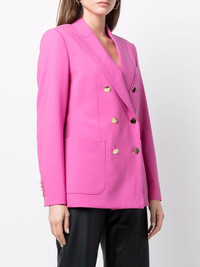 double-breasted tailored blazer hot pink virgin wool-mohair blend peak lapels front button fastening long sleeves slit pocket at the chest two front patch pockets English rear vents Made in Italy Composition Lining: Cupro 100%, Viscose 65%, Polyester 35% Outer: Virgin Wool 63%, Mohair 34%, Spandex/Elastane 2% SIZE & FIT Model measurements Height 5 ft 9 in(1.75 m) Bust/Chest 32.67 in(83 cm) Hips 36.22 in(92 cm) Waist 24.8 in(63 cm) FittingInformation This piece fits true to size. We recommend you get your regular size Cut for a slim fit Made with a mid-weight fabric