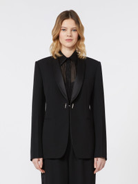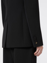 DETAILS Single-breasted blazer with a feminine silhouette. Pure wool gabardine blazer with an organza feel Fitted line Satin tuxedo lapel Set-in sleeves with cut detail on the inner elbow Cufflink closure with chain and jewel button Chest pocket and welt pockets on the sides Lined in Monogram jacquard fabric COMPOSITION AND CARE Fabric 100% virgin wool; fabric 2 100% polyester; lining 65% acetate, 35% polyester. Do not wash; do not bleach; do not tumble dry; cool iron; professionally dry clean perchloroethylene - mild process; do not wet clean.; wash the garment while it is fastened.; do not iron the buttons.; protect buttons before washing.; turn the articles inside out before washing.; remove the cufflinks before washing. Distributed by Max Mara S.r.l., registered office in Reggio Emilia (Italy), Via Giulia Maramotti 4, 42124 (IT)