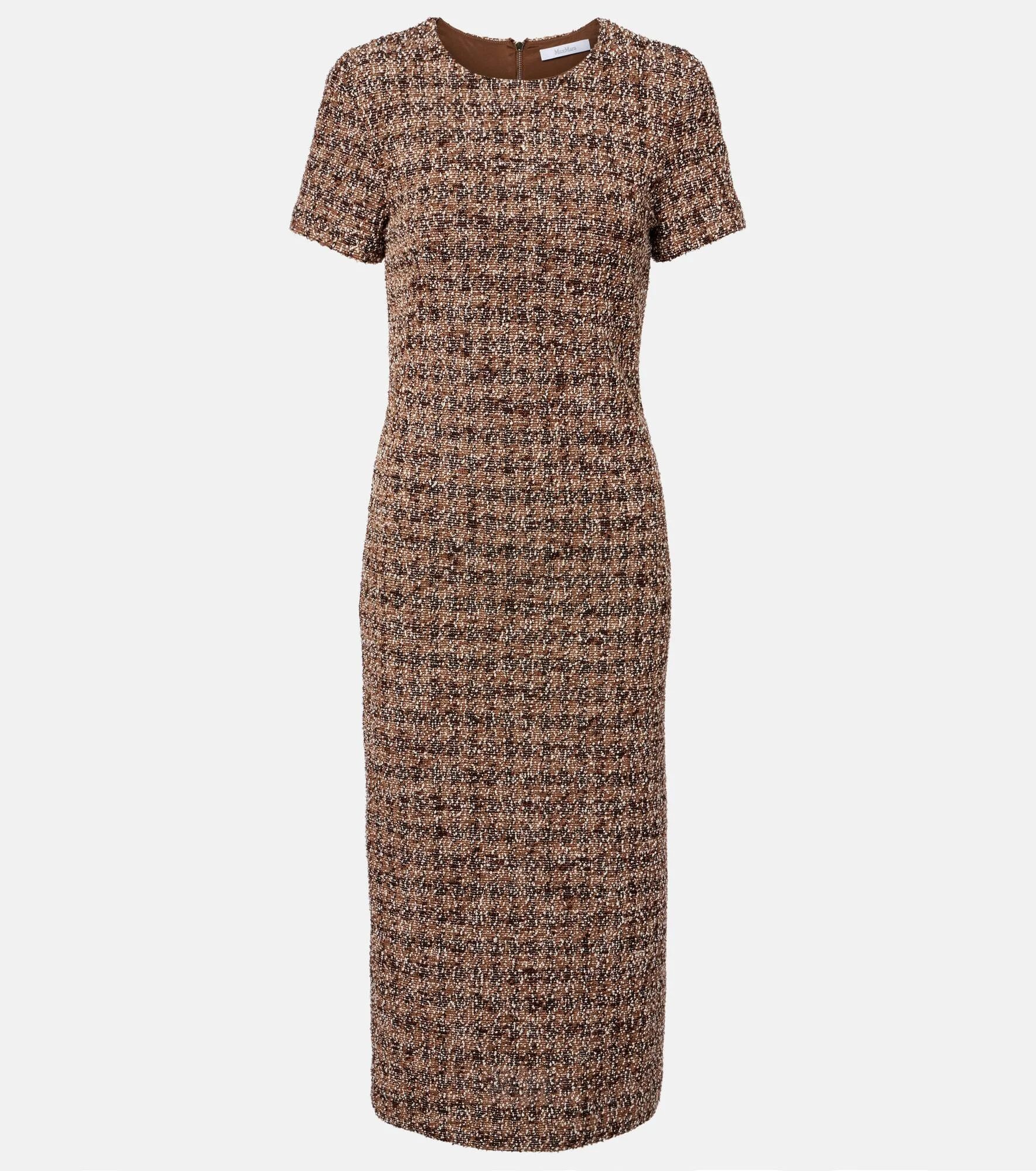 Boasting a rich manufacturing history, Max Mara represents the quintessence of Italian sophistication and expertise. The Giugno midi dress is crafted from cotton and wool-blend tweed into a short-sleeved, fitted silhouette. Product Details - Material: 48% cotton, 37% wool, 10% polyester, 4% polyamide, 1% elastane - Care instructions: dry clean - Made in Romania - Designer color name: DIS.P.D.P - Item color: multicolor, brown - Lining: 95% acetate, 5% elastane - Closure: concealed zipped back - Short vent - Item number: P01090704 Size & Fit - True to size - Fitted - Stretchy fabric - slit length 21cm-8.5" - The model seen in the picture is 178cm-5'10" and wearing a size DE 34