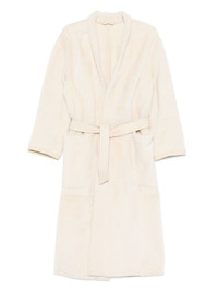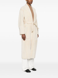 shearling coat Highlights - White - Tied waist - Two side patch pockets - V-neck - Long sleeves Imported Composition Sheep Skin/Shearling 100% SIZE & FIT Model measurements Height 5 ft 11 in(1.8 m) Bust/Chest 31.49 in(80 cm) Hips 36.61 in(93 cm) Waist 24.4 in(62 cm) FittingInformation Designed to be unstructured, offering a loose fit throughout The belt offers adjustability for fitted preferences Firm shearling has a treated construction offering some durability
