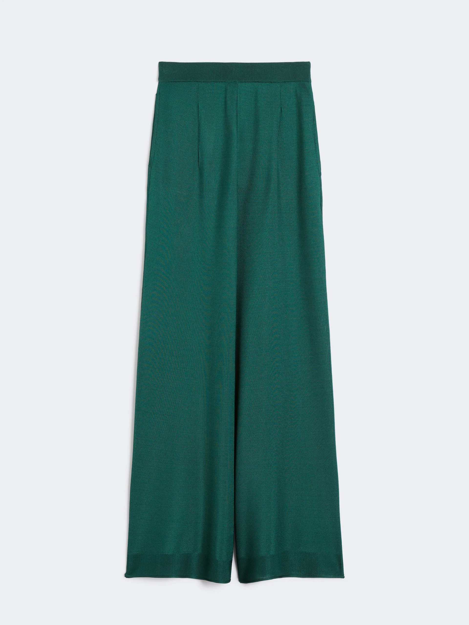 DETAILS Wide-leg trousers featuring a moss stitch knit. - The main fabric of this garment contains raw materials derived from wood cellulose, a fibre produced with respect for the forest - Viscose yarn trousers - Loose fit - Side inset pockets - Ribbed elasticated waistband - Double pleats at the front waist COMPOSITION AND CARE 100% viscose. Do not wash; do not bleach; do not tumble dry; cool iron; professionally dry clean perchloroethylene - mild process; do not wet clean.; iron with a cloth between. Distributed by Max Mara S.r.l., registered office in Reggio Emilia (Italy), Via Giulia Maramotti 4, 42124 (IT)