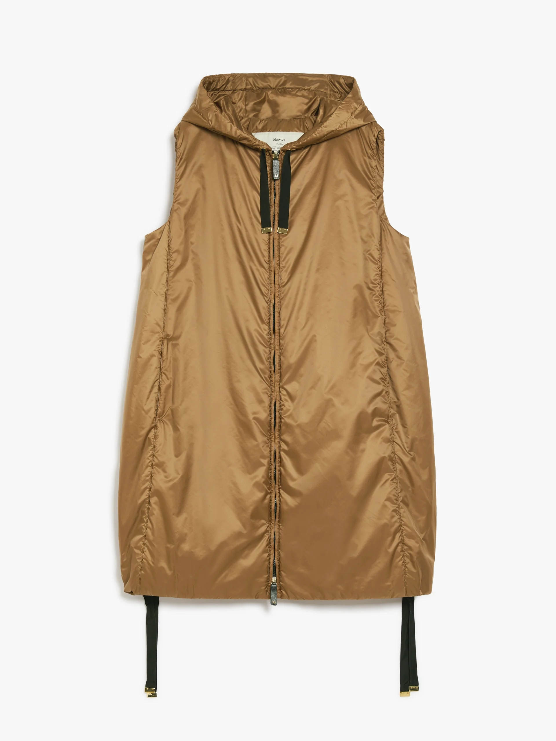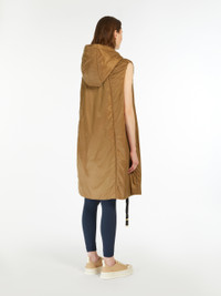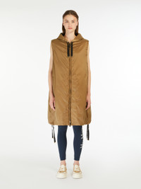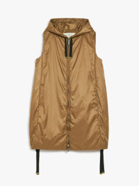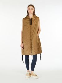 DETAILS Midi gilet with hood and drawstring hem. Water-repellent technical canvas gilet The style is distinguished by the Cameluxe padding Loose fit Side inset pockets Front zip fastening with leather double slider COMPOSITION AND CARE Fabric 100% polyester; lining 100% polyester; with quilting in 48% polyester, 48% camelwool, 4% silk; - exclusive of decoration. Do not wash; do not bleach; do not tumble dry; do not iron; professionally dry clean perchloroethylene - mild process; do not wet clean.; wash the garment while it is fastened.; don’t iron the labels.; do not iron the ribbons.; protect the ends stoppers and/or the cord ends before washing.; turn the articles inside out before washing.; take off the zip tongue before washing.; contains non-textile parts of animal origin. Distributed by Max Mara S.r.l., registered office in Reggio Emilia (Italy), Via Giulia Maramotti 4, 42124 (IT)