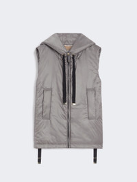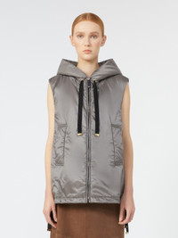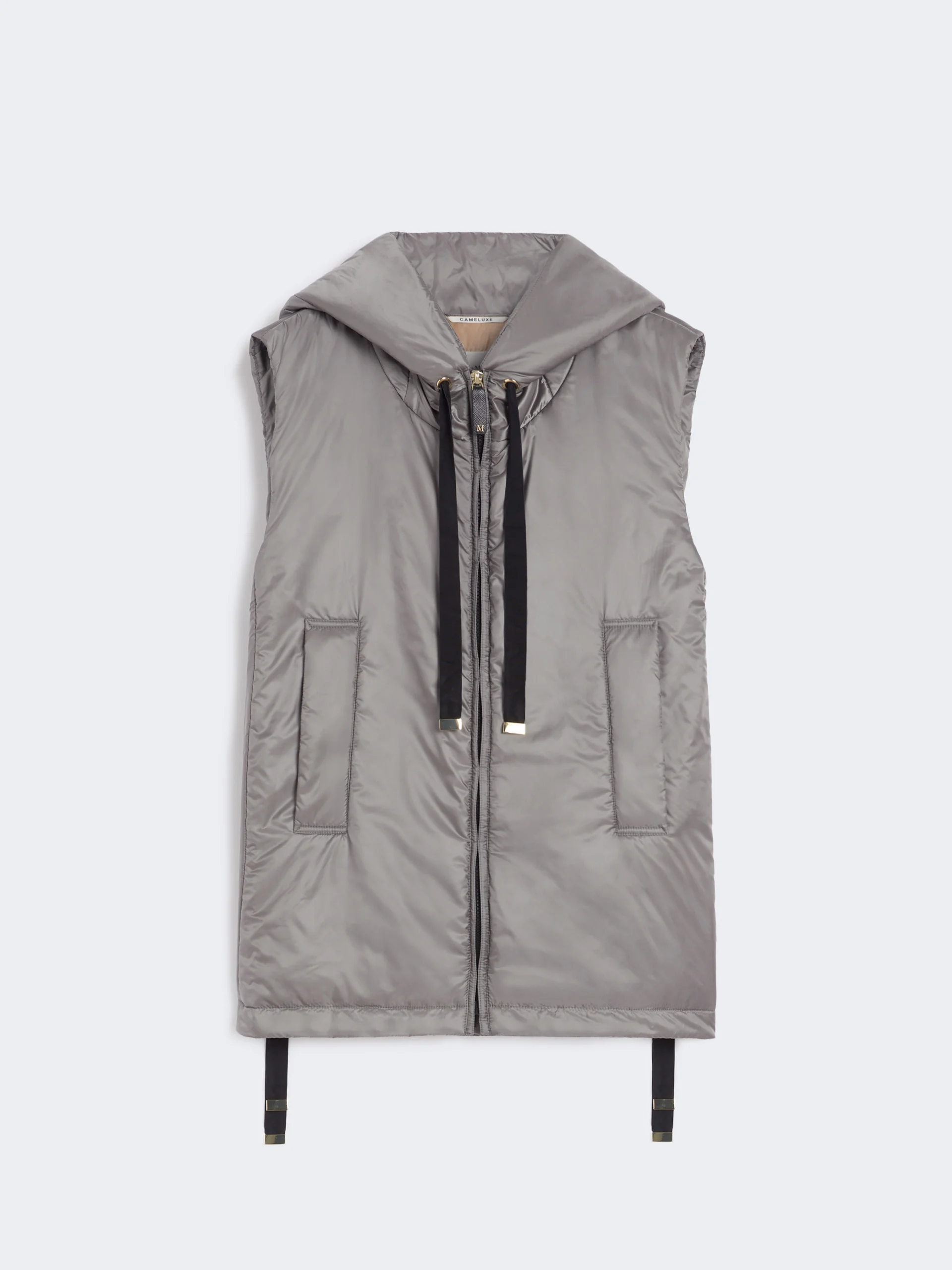 DETAILS Short gilet with hood and drawstring hem. - The style is distinguished by the Cameluxe padding - Water-repellent canvas gilet - Slightly flared line - Front fastening with zip and leather zip pull with metallic Monogram - Welt pockets on the sides COMPOSITION AND CARE Fabric 100% polyester; lining 100% polyester; with quilting in 48% polyester, 48% camelwool, 4% silk; - exclusive of decoration. Do not wash; do not bleach; do not tumble dry; do not iron; professionally dry clean perchloroethylene - mild process; do not wet clean.; wash the garment while it is fastened.; don’t iron the labels.; do not iron the ribbons.; protect the ends stoppers and/or the cord ends before washing.; turn the articles inside out before washing.; take off the zip tongue before washing.; contains non-textile parts of animal origin. Distributed by Max Mara S.r.l., registered office in Reggio Emilia (Italy), Via Giulia Maramotti 4, 42124 (IT)