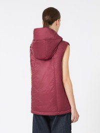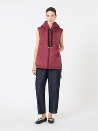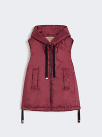 DETAILS Short gilet with hood and drawstring hem. The style is distinguished by the Cameluxe padding Water-repellent canvas gilet Slightly flared line Front fastening with zip and leather zip pull with metallic Monogram Welt pockets on the sides COMPOSITION AND CARE Fabric 100% polyester; lining 100% polyester; with quilting in 48% polyester, 48% camelwool, 4% silk; - exclusive of decoration. Do not wash; do not bleach; do not tumble dry; do not iron; professionally dry clean perchloroethylene - mild process; do not wet clean.; wash the garment while it is fastened.; don’t iron the labels.; do not iron the ribbons.; protect the ends stoppers and/or the cord ends before washing.; turn the articles inside out before washing.; take off the zip tongue before washing.; contains non-textile parts of animal origin. Distributed by Max Mara S.r.l., registered office in Reggio Emilia (Italy), Via Giulia Maramotti 4, 42124 (IT)