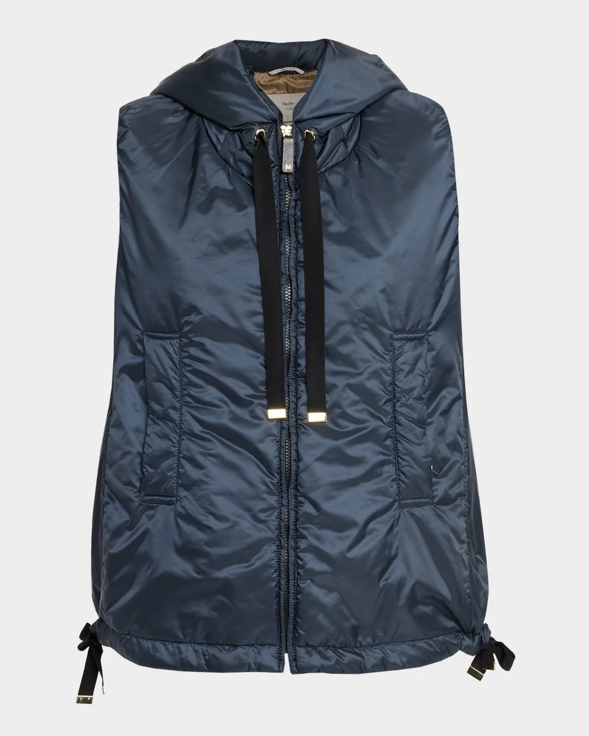 Max Mara "Greengo" short gilet is crafted of water-repellent canvas with bright hardware accents Drawstring hood Zip front closure Side welt pockets Straight hem Relaxed fit Polyester Lining: Polyester Fill: Cameluxe padding (camel hair/polyester) Dry clean Made in Italy SIZE & FITModel measurements: 5 & apos;10" tallModel is wearing a US size 4/Small