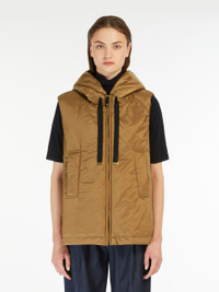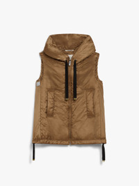 DETAILS Short gilet with hood and drawstring hem. Upcycled water-repellent technical canvas gilet The style is distinguished by the Cameluxe padding Slightly flared line Welt pockets on the sides Front zip fastening with leather zip-pull COMPOSITION AND CARE Fabric 100% polyester; lining 100% polyester; with quilting in 48% polyester, 48% camelwool, 4% silk; - exclusive of decoration. Do not wash; do not bleach; do not tumble dry; do not iron; professionally dry clean perchloroethylene - mild process; do not wet clean.; wash the garment while it is fastened.; don’t iron the labels.; do not iron the ribbons.; protect the ends stoppers and/or the cord ends before washing.; turn the articles inside out before washing.; take off the zip tongue before washing.; contains non-textile parts of animal origin. Distributed by Max Mara S.r.l., registered office in Reggio Emilia (Italy), Via Giulia Maramotti 4, 42124 (IT)