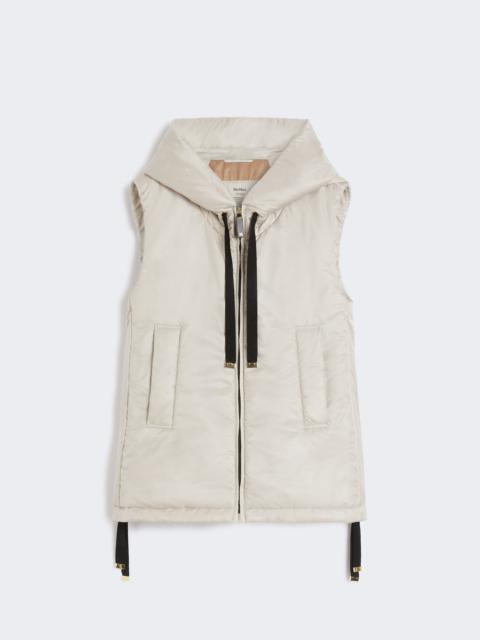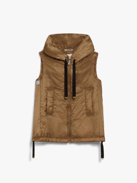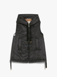 DETAILS Short gilet with hood and drawstring hem. Upcycled water-repellent technical canvas gilet The style is distinguished by the Cameluxe padding Slightly flared line Welt pockets on the sides Front zip fastening with leather zip-pull COMPOSITION AND CARE Fabric 100% polyester; lining 100% polyester; with quilting in 48% polyester, 48% camelwool, 4% silk; - exclusive of decoration. Do not wash; do not bleach; do not tumble dry; do not iron; professionally dry clean perchloroethylene - mild process; do not wet clean.; wash the garment while it is fastened.; don’t iron the labels.; do not iron the ribbons.; protect the ends stoppers and/or the cord ends before washing.; turn the articles inside out before washing.; take off the zip tongue before washing.; contains non-textile parts of animal origin. Distributed by Max Mara S.r.l., registered office in Reggio Emilia (Italy), Via Giulia Maramotti 4, 42124 (IT)