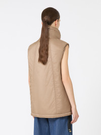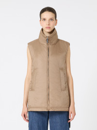DETAILS Regular fit gilet with a high neck and adjustable drawstring at the hem. The style is distinguished by the Cameluxe padding Water-repellent canvas gilet Front fastening with zip and leather zip pull with metallic Monogram Welt pockets on the sides COMPOSITION AND CARE Fabric 100% polyester; lining 100% polyester; with quilting in 48% polyester, 48% camelwool, 4% silk; - exclusive of decoration. Do not wash; do not bleach; do not tumble dry; do not iron; professionally dry clean perchloroethylene - mild process; do not wet clean.; wash the garment while it is fastened.; don’t iron the labels.; protect the ends stoppers and/or the cord ends before washing.; turn the articles inside out before washing.; take off the zip tongue before washing.; contains non-textile parts of animal origin. Distributed by Max Mara S.r.l., registered office in Reggio Emilia (Italy), Via Giulia Maramotti 4, 42124 (IT)