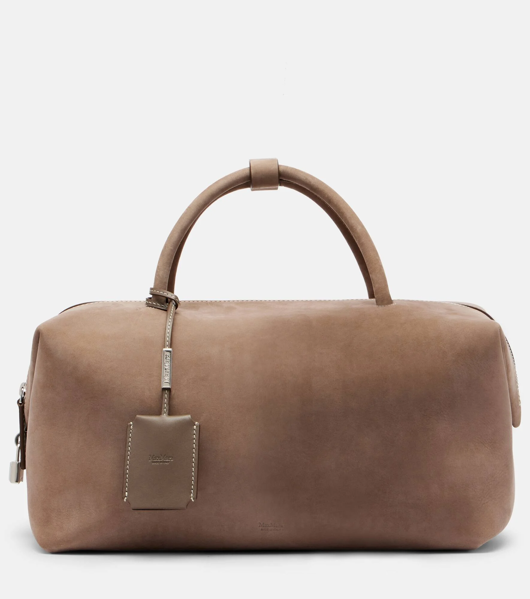 Boasting a rich manufacturing history, Max Mara represents the quintessence of Italian sophistication and expertise. The Holdall Medium tote bag is carefully crafted from suede with a protective bottom, detachable leather charm, and zipped top. Product Details - Material: calf leather (suede) - Lining: suede - Made in Italy - Color: brown - Designer color name: Elefante - Item color: brown - Hardware color: silver - Top handles, Detachable shoulder strap - Closure: zipped top - Internal details: internal slot pockets - Protective leather bottom - Includes: dust bag - Detachable charm - Item number: P01115385 Size & Fit - Height 17cm-6.5" - Width 33cm-13" - Depth 17,5cm-7" - Length of handles 32cm-12.5" - Length shoulder strap 117cm-46"