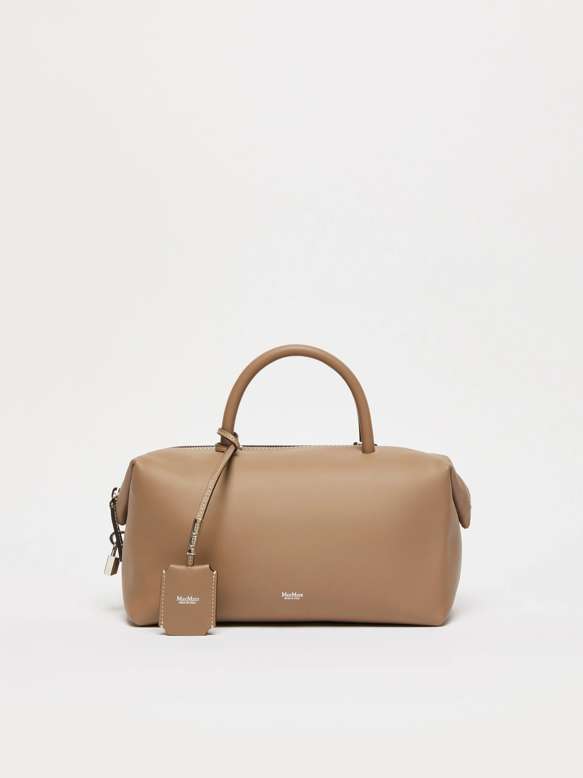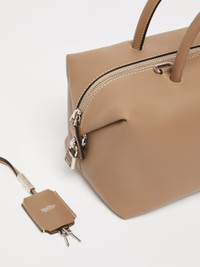 DETAILS Handbag with two handles and slightly folded sides. Complete with removable shoulder strap for crossbody wear, custom key tag, leather feet and metal Max Mara lettering on the front. Natural calfskin bag Suede interior with flat M-shaped inner pocket Zip fastening at the top and branded padlock on one side Size: 26 x 15 x 13 cm COMPOSITION AND CARE Handbag in calf; inside in goat leather. Distributed by Max Mara S.r.l., registered office in Reggio Emilia (Italy), Via Giulia Maramotti 4, 42124 (IT)