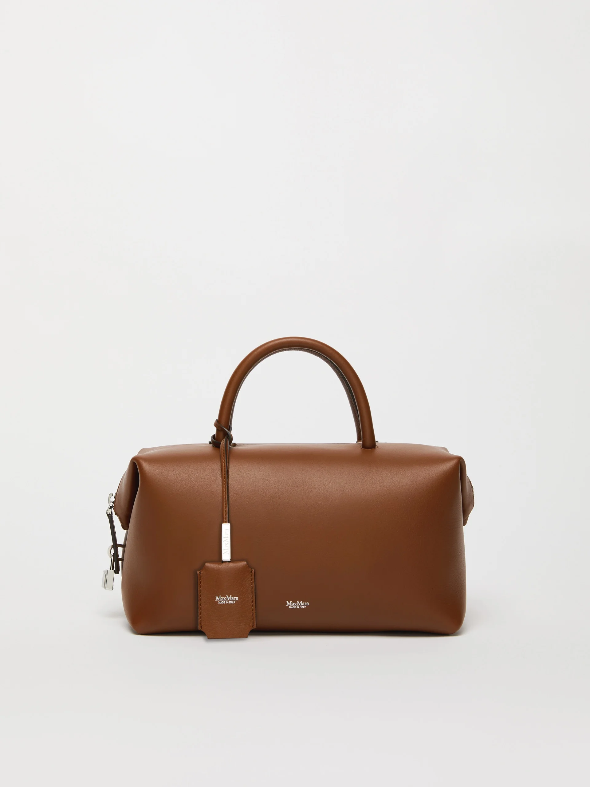 DETAILS Handbag with two handles and slightly folded sides. Complete with removable shoulder strap for crossbody wear, custom key tag, leather feet and metal Max Mara lettering on the front. Natural calfskin bag Suede interior with flat M-shaped inner pocket Zip fastening at the top and branded padlock on one side Size: 26 x 15 x 13 cm COMPOSITION AND CARE Handbag in calf; inside in goat leather. Distributed by Max Mara S.r.l., registered office in Reggio Emilia (Italy), Via Giulia Maramotti 4, 42124 (IT)