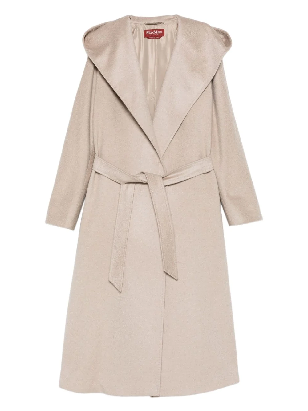 hooded belted coat Highlights - Beige - Hooded neckline - Self-tie belt - Long sleeves - Wrap-front - Straight hem Imported Composition Fabric 100%