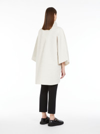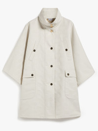 DETAILS Short cape in water-resistant technical fabric with all-over jacquard Monogram motif. Unlined style with a classic, very wide poncho silhouette, with a high neck, hand warmer pockets and large patch pockets on the bottom with a flap and snap-buttons. The side snap-buttons create the effect of short sleeves. Front closure with shiny galvanised metal snap-buttons, customised with Max Mara lettering. COMPOSITION AND CARE 100% polyester. Machine wash cold delicate cycle; do not bleach; do not tumble dry; line drying in the shade; cool iron; professionally dry clean perchloroethylene - mild process. Distributed by Max Mara S.r.l., registered office in Reggio Emilia (Italy), Via Giulia Maramotti 4, 42124 (IT)
