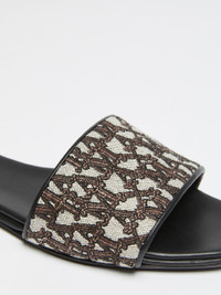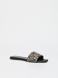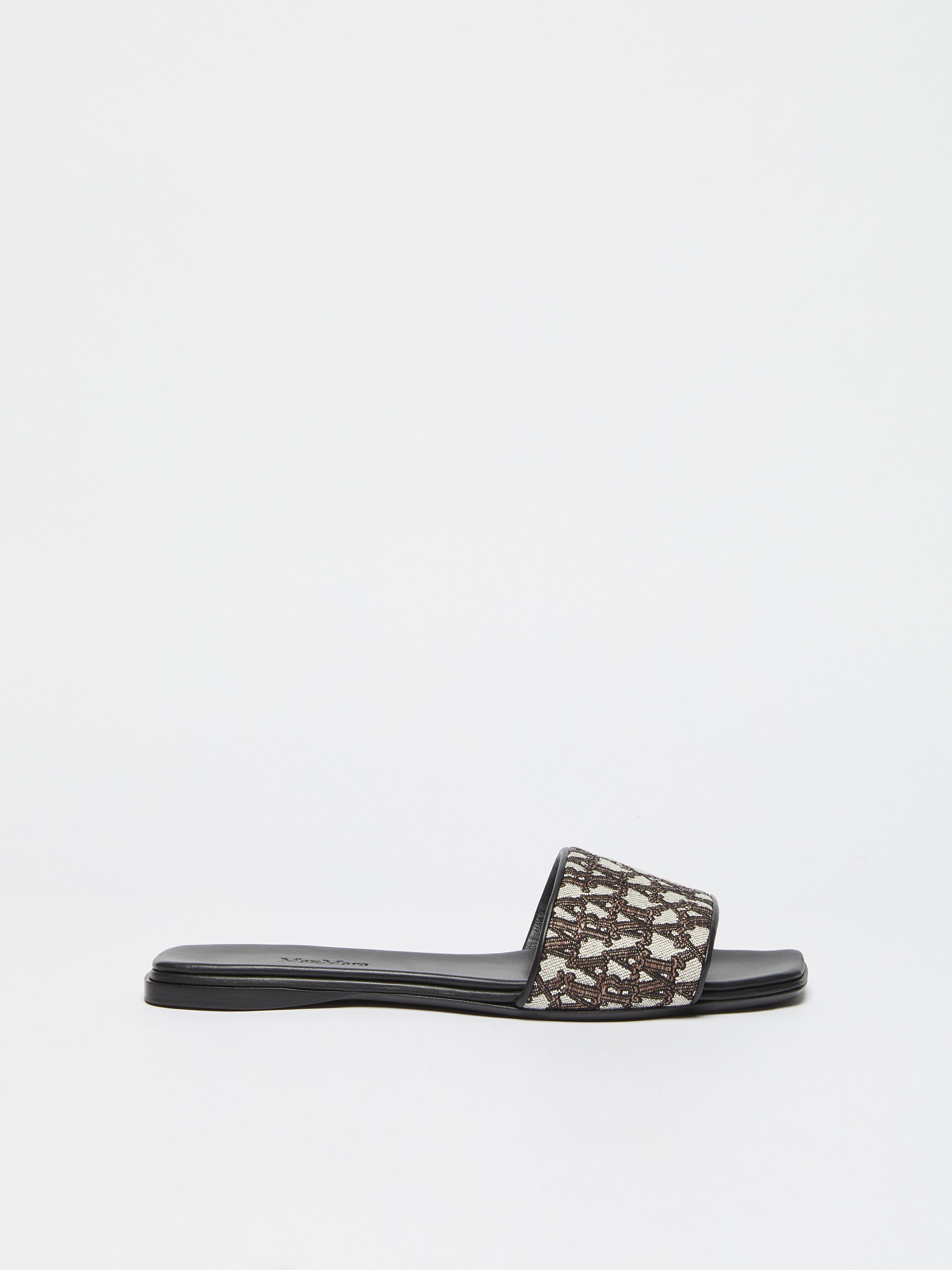 DETAILS Flat sandals with wide padded band made of raffia-effect fabric with an all-over MaxMaraGram jacquard design. The style has a square toe, slip heel and small wedge for a comfortable fit. Finished with a leather lining, slightly padded insole and leather sole with non-slip oversized M Monogram. COMPOSITION AND CARE Upper in 44% cotton, 28% polyester, 28% nylon; lining in ram; sole in leather. Distributed by Max Mara S.r.l., registered office in Reggio Emilia (Italy), Via Giulia Maramotti 4, 42124 (IT)