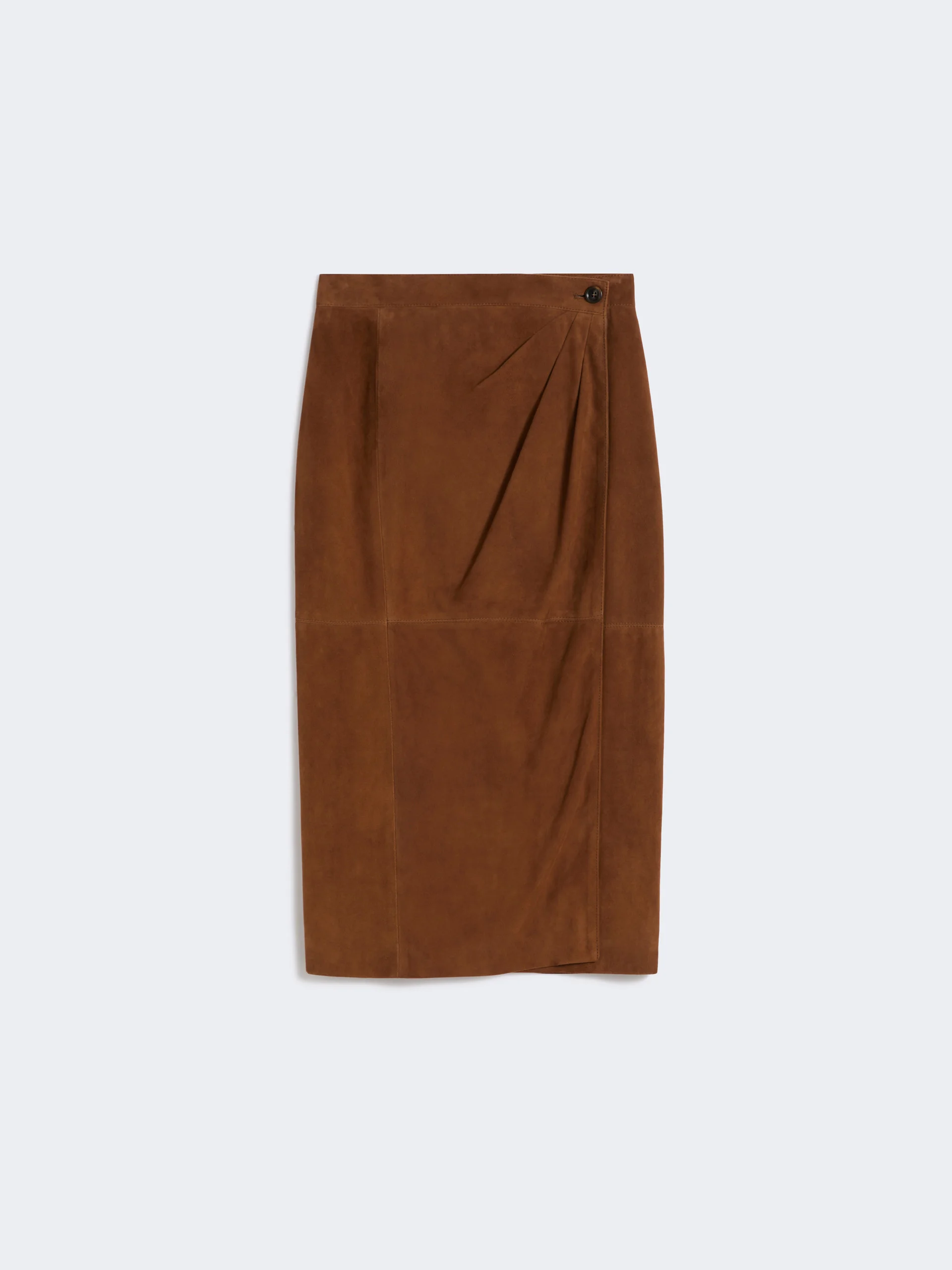 DETAILS Midi skirt with seams and stitching that highlight the silhouette. Suede skirt Figure-hugging Wrap closure with asymmetric button at the waist Semi-stitched draped motif on the left side Lined COMPOSITION AND CARE Style in goat leather; lining 95% acetate, 5% elastane. Do not wash; do not bleach; do not tumble dry; do not iron; do not dry clean; do not wet clean.; do not wash or dry clean by fabric methods. clean only by leather and fur specialists.; do not iron the buttons.; care should be taken with light-coloured garments and accessories because body heat could lead the leather to colour loss and staining. care should be taken when sitting on light-coloured surfaces, especially if damp. avoid lengthy exposure to direct light or heat sources. do not store garments in plastic bags for long periods. Distributed by Max Mara S.r.l., registered office in Reggio Emilia (Italy), Via Giulia Maramotti 4, 42124 (IT)