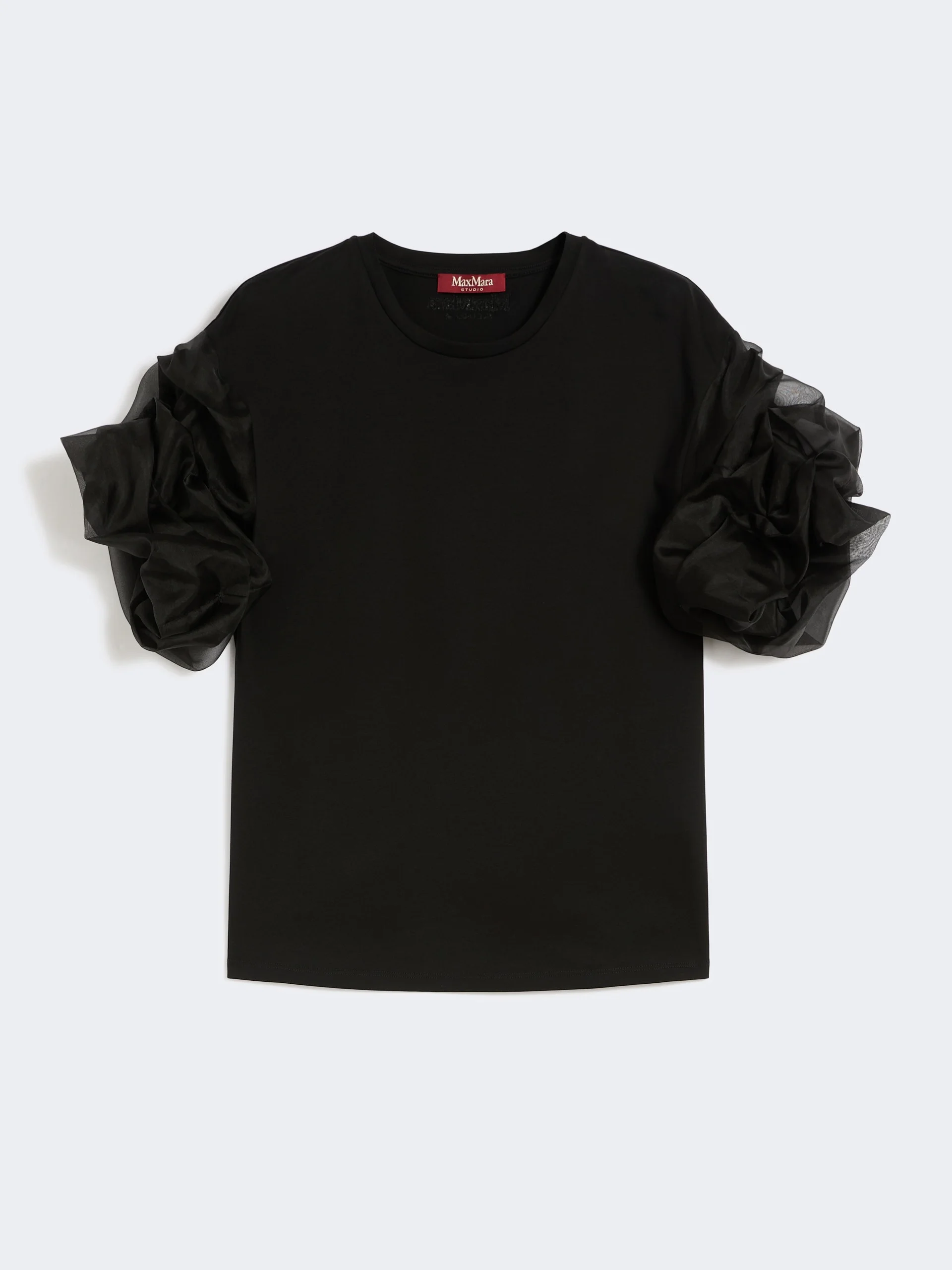 DETAILS Couture T-shirt featuring short "cloud"-look sleeves in fine silk organza fabric. - Pure cotton jersey T-shirt - Straight fit - Crew-neck - Max Mara logo embroidered with rhinestones on the back of the neck COMPOSITION AND CARE Jersey fabric 100% cotton; sleeves 100% silk; - exclusive of decoration. Machine wash cold delicate cycle; do not bleach; do not tumble dry; flat drying in the shade; cool iron; do not dry clean; professional wet cleaning - very mild process.; iron with a cloth between.; using neutral detergent.; don’t rub.; turn the articles inside out before washing.; to be ironed on reverse. Distributed by Max Mara S.r.l., registered office in Reggio Emilia (Italy), Via Giulia Maramotti 4, 42124 (IT) Collection: Studio Product code: 6941036406005 - MSEDRITTO