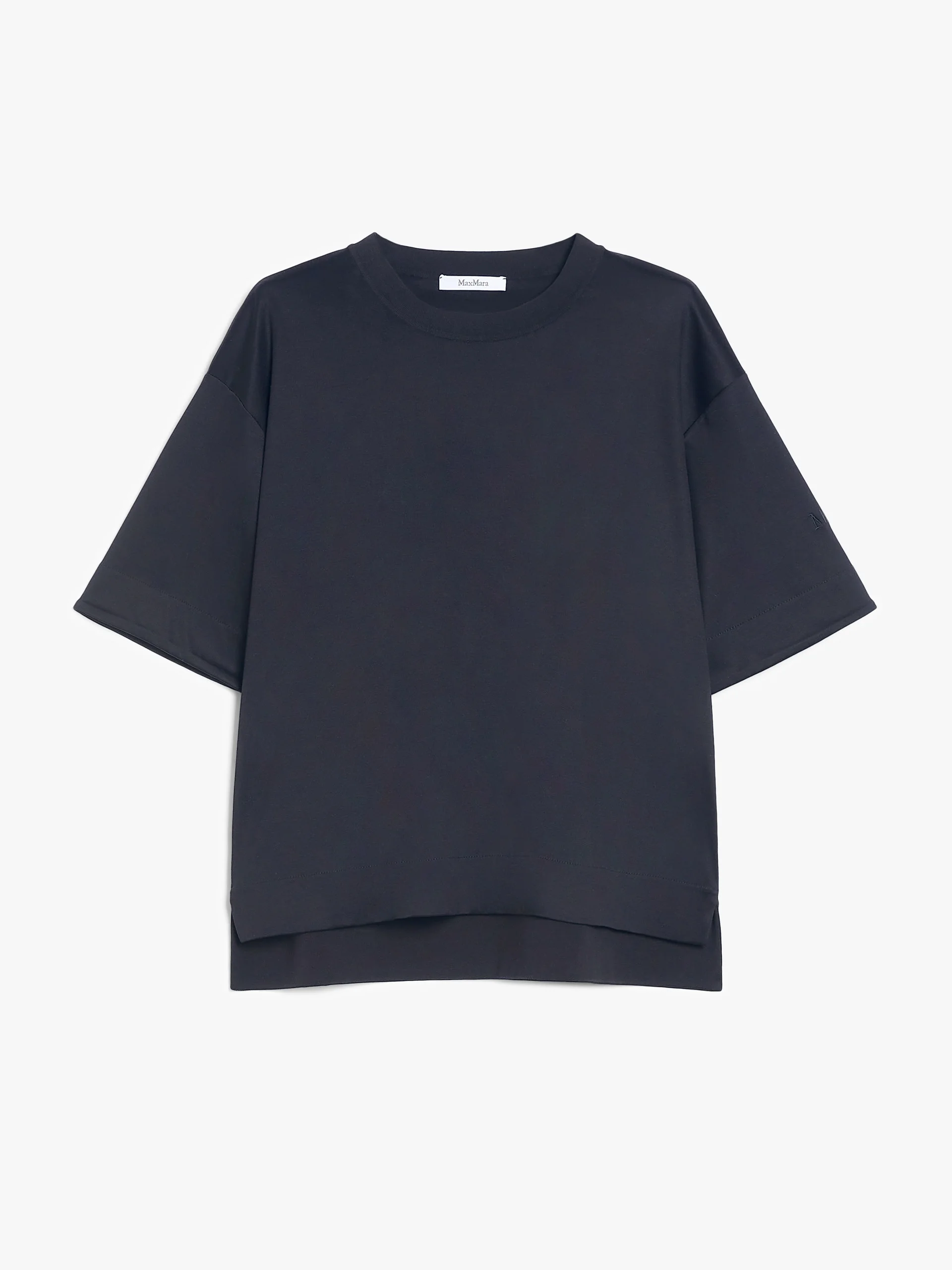 DETAILS Short-sleeved T-shirt in pure-cotton interlock, featuring an oversized fit with a crew neck in tone-on-tone knit, dropped shoulders and small slits on the sides. Asymmetrical hem that is slightly longer at the back. Customised with a matching embroidered logo on the left sleeve. COMPOSITION AND CARE Jersey fabric 100% cotton; - exclusive of embroideries. Machine wash cold delicate cycle; do not bleach; do not tumble dry; flat drying in the shade; cool iron; professionally dry clean perchloroethylene - mild process; professional wet cleaning - very mild process.; iron with a cloth between.; using neutral detergent.; turn the articles inside out before washing.; to be ironed on reverse. Distributed by Max Mara S.r.l., registered office in Reggio Emilia (Italy), Via Giulia Maramotti 4, 42124 (IT)