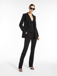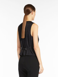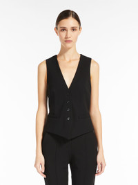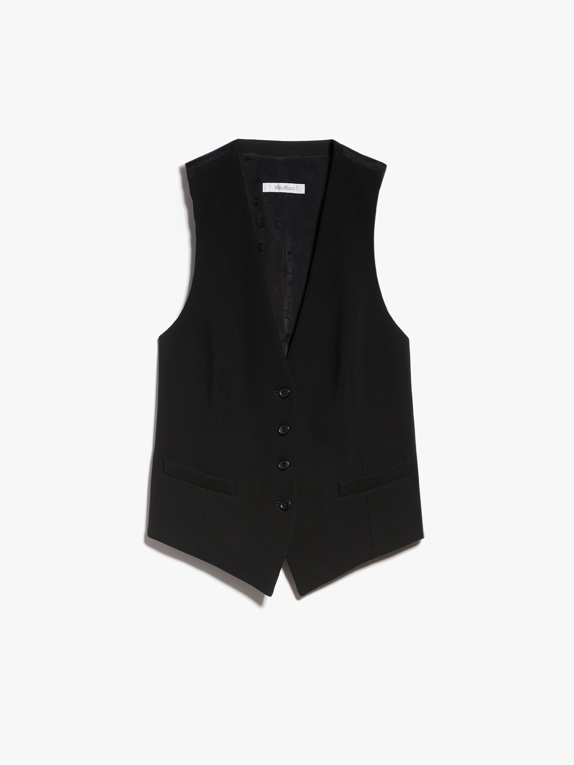 DETAILS Short masculine-inspired gilet made of soft viscose, with V neck and front welt pockets. The model features a stretch fabric logo insert on the back, a strap and metallic gilet buckle. Front fastening with horn buttons. Length: 51 cm. COMPOSITION AND CARE Back 68% acetate, 32% polyester; outer fabric 78% viscose, 16% polyamide, 6% elastane; inner fabric 100% polyester; lining 68% acetate, 32% polyester. Do not wash; do not bleach; do not tumble dry; cool iron; professionally dry clean perchloroethylene - mild process; do not wet clean.; iron with a cloth between. Distributed by Max Mara S.r.l., registered office in Reggio Emilia (Italy), Via Giulia Maramotti 4, 42124 (IT)