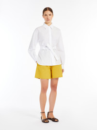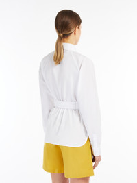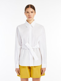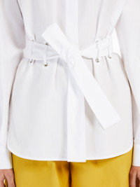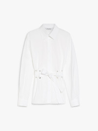 DETAILS Pure cotton poplin shirt, featuring belt loops with brass eyelets and a matching belt to highlight the silhouette. The style features a classic pointed collar, long kimono sleeves with a raglan cut on the back, cuffs and a side button. Finished with rounded side slits and fastened with concealed buttons. COMPOSITION AND CARE 100% cotton. Machine wash cold delicate cycle; do not bleach; do not tumble dry; line drying in the shade; cool iron; professionally dry clean perchloroethylene - mild process.; do not iron the buttons. Distributed by Max Mara S.r.l., registered office in Reggio Emilia (Italy), Via Giulia Maramotti 4, 42124 (IT)