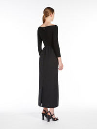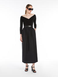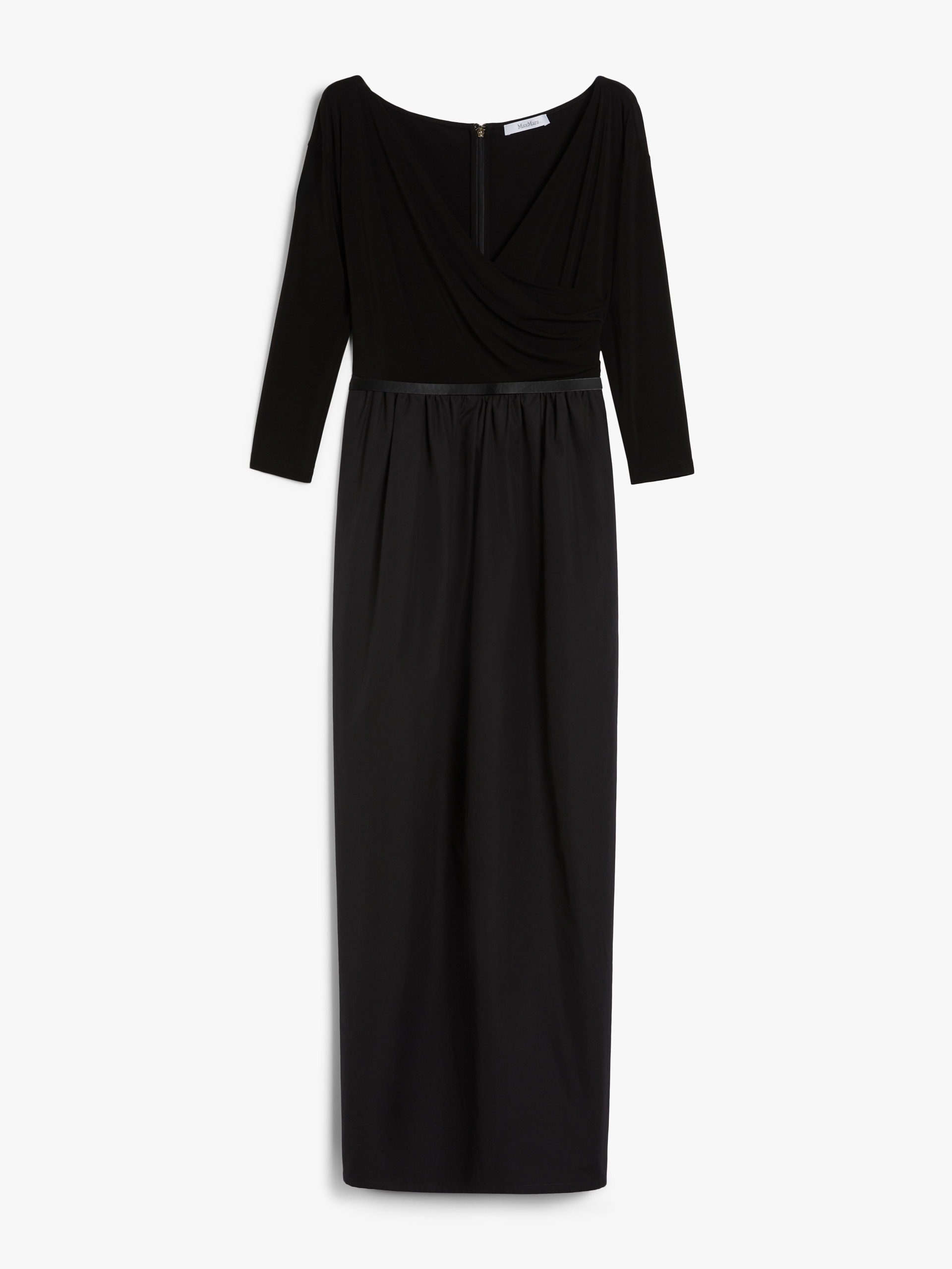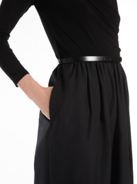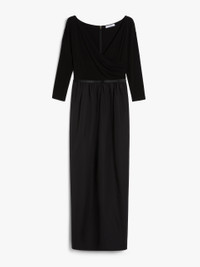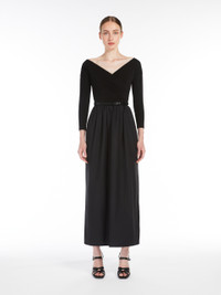 DETAILS Long dress in soft stretch viscose jersey, featuring a fit and flare fit with a pure cotton poplin skirt. The style features a crossover V neck at the front with a gathered motif on the left side when worn, three-quarter sleeves and side inset pockets. The matching leather belt allows you to accentuate the waist. Finished with a centre back vent and belt loops. Invisible zip fastening on the back. COMPOSITION AND CARE Jersey dress upper part 92% viscose, 8% elastane; lower part 100% cotton; - exclusive of accessories. Belt calf. Jersey dress: hand wash cold; do not bleach; do not tumble dry; flat drying in the shade; cool iron; professionally dry clean perchloroethylene - mild process; do not wet clean.; Iron with a cloth between.; Using neutral detergent.; Before cleaning the style remove the accessories.; Don’t rub.; Remove the belt before washing.; Turn the articles inside out before washing.; To be ironed on reverse. Belt: do not wash; do not bleach; do not tumble dry; do not iron; do not dry clean; do not wet clean. Distributed by Max Mara S.r.l., registered office in Reggio Emilia (Italy), Via Giulia Maramotti 4, 42124 (IT)