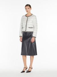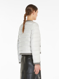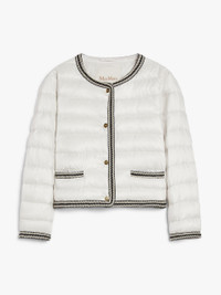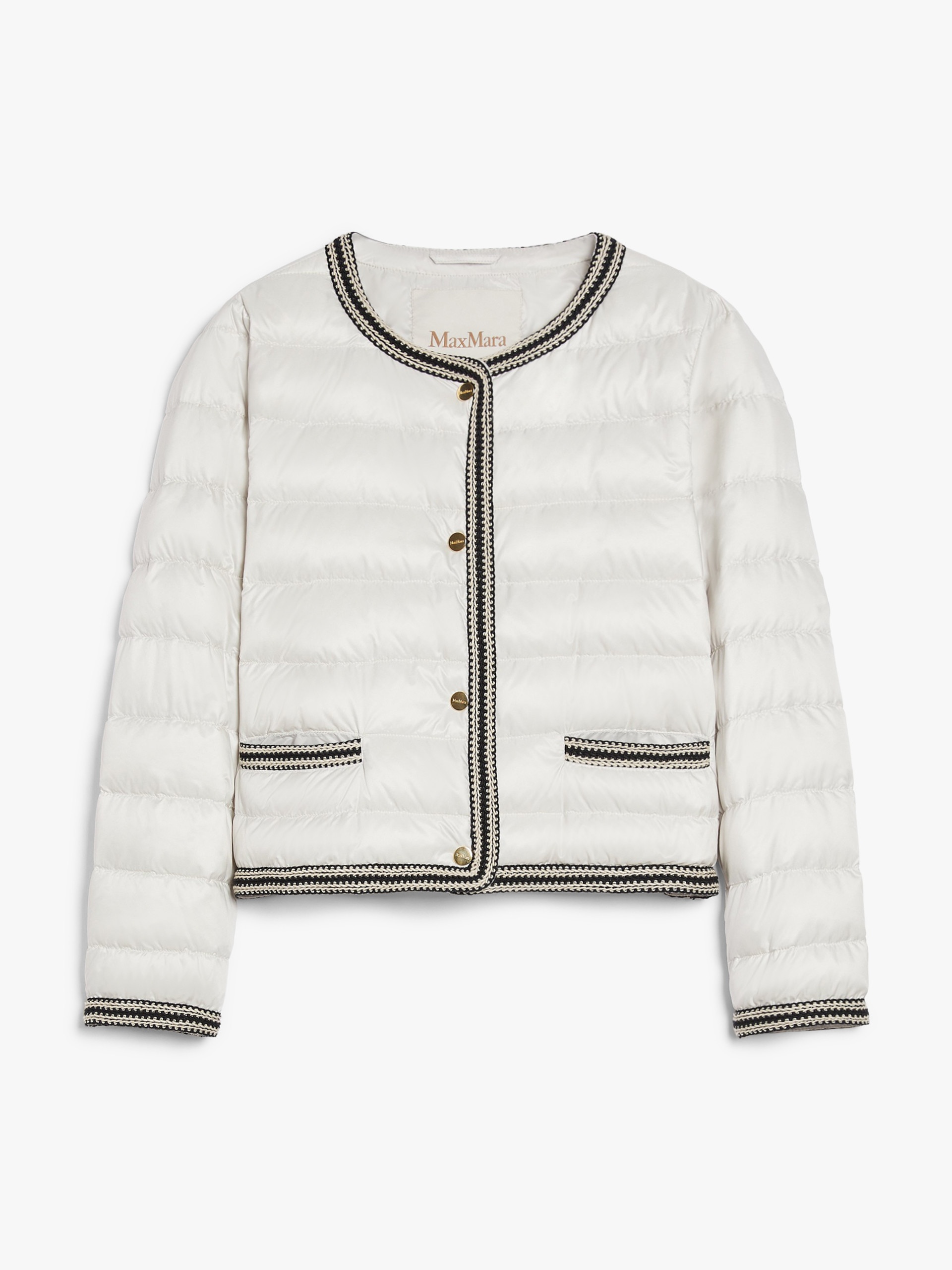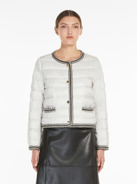 DETAILS Short jacket in water-repellent iridescent technical canvas featuring goose down padding and all-over horizontal-stripe quilting. The crew-neck model boasts long set-in sleeves and horizontal-welt pockets, complete with contrasting two-tone passementerie-decorated trims and flap detail. Gold-coloured branded metal button fastening on the front. COMPOSITION AND CARE Fabric 100% polyester; lining 100% polyester; - exclusive of decoration; with quilting virgin goose-down. Machine wash cold delicate cycle; do not bleach; do not tumble dry; line drying in the shade; cool iron; professionally dry clean perchloroethylene - mild process.; wash the garment while it is fastened.; don’t iron the labels.; turn the articles inside out before washing.; contains non-textile parts of animal origin. Distributed by Max Mara S.r.l., registered office in Reggio Emilia (Italy), Via Giulia Maramotti 4, 42124 (IT)