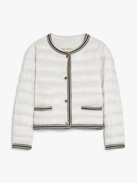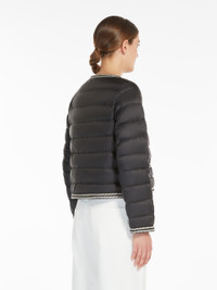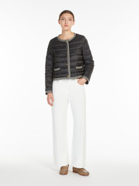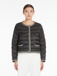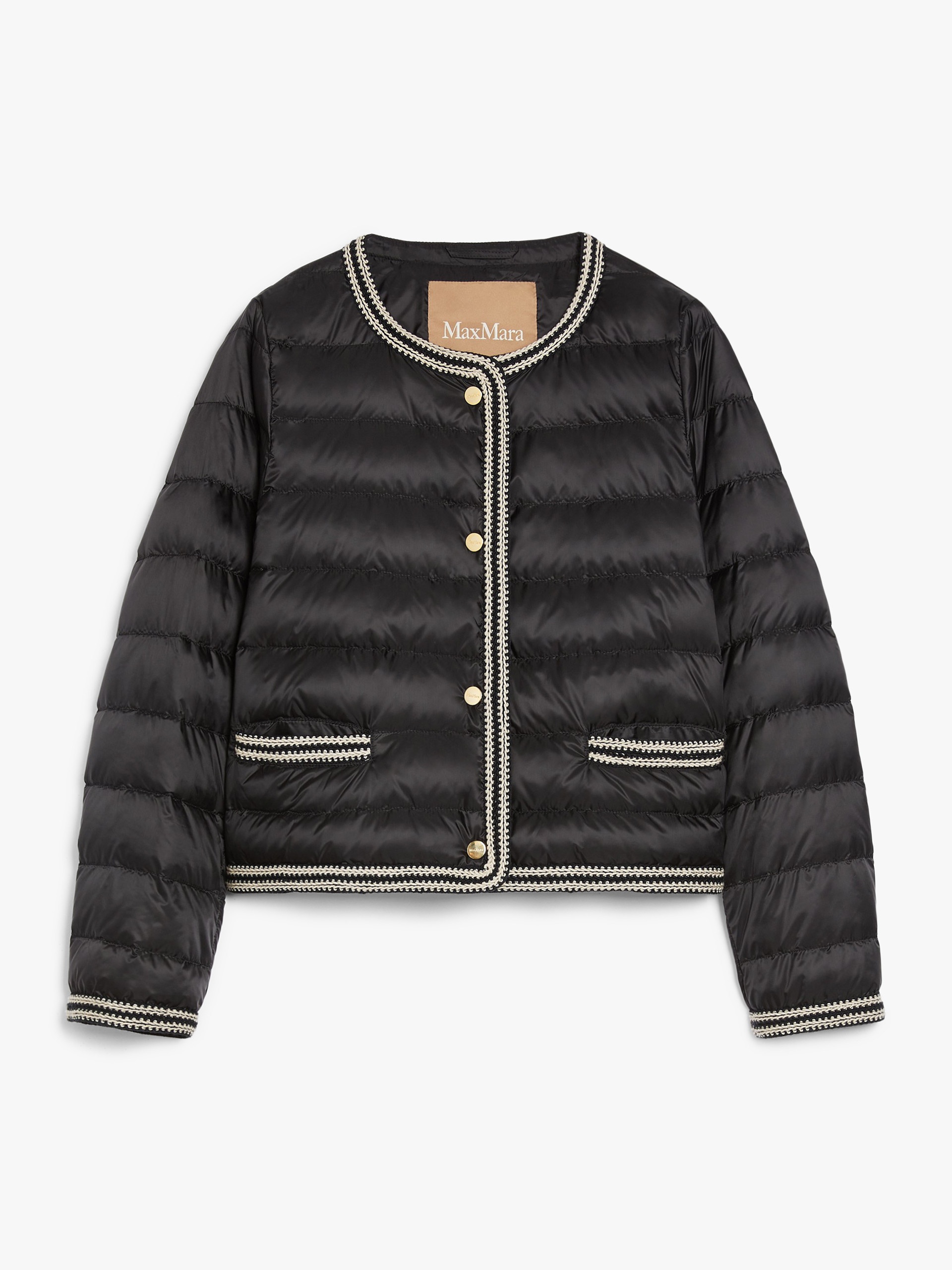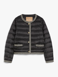 DETAILS Short jacket in water-repellent iridescent technical canvas featuring goose down padding and all-over horizontal-stripe quilting. The crew-neck model boasts long set-in sleeves and horizontal-welt pockets, complete with contrasting two-tone passementerie-decorated trims and flap detail. Gold-coloured branded metal button fastening on the front. COMPOSITION AND CARE Fabric 100% polyester; lining 100% polyester; - exclusive of decoration; with quilting virgin goose-down. Machine wash cold delicate cycle; do not bleach; do not tumble dry; line drying in the shade; cool iron; professionally dry clean perchloroethylene - mild process.; wash the garment while it is fastened.; don’t iron the labels.; turn the articles inside out before washing.; contains non-textile parts of animal origin. Distributed by Max Mara S.r.l., registered office in Reggio Emilia (Italy), Via Giulia Maramotti 4, 42124 (IT)