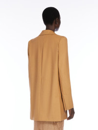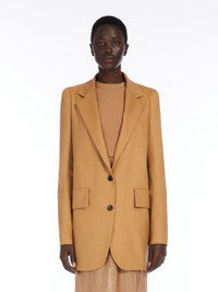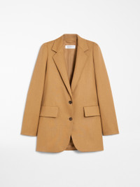 DETAILS Single-breasted blazer with an elongated line, made of luxurious wool, mohair and silk cloth. The garment features an oversized fit with lapel collar, long set-in sleeves and patch pockets with flap on the front. Lined and featuring a stitched pleat motif on the shoulders and a front fastening with two visible buttons. COMPOSITION AND CARE Fabric 71% virgin wool, 18% mohair, 11% silk; lining 65% acetate, 35% polyester. Do not wash; do not bleach; do not tumble dry; cool iron; professionally dry clean perchloroethylene - mild process; do not wet clean.; do not iron the buttons.; protect buttons before washing.; contains non-textile parts of animal origin. Distributed by Max Mara S.r.l., registered office in Reggio Emilia (Italy), Via Giulia Maramotti 4, 42124 (IT)