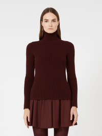 DETAILS Turtleneck jumper featuring a ribbed knit that accentuates the silhouette. Stretch wool and cashmere yarn turtleneck Figure-hugging High neck Long sleeves Half zip on the back of the neck with customised enamel slider COMPOSITION AND CARE 66% wool, 28% cashmere, 5% polyamide, 1% elastane. Hand wash cold (40°c max); do not bleach; do not tumble dry; flat drying in the shade; cool iron; professionally dry clean perchloroethylene - mild process; do not wet clean.; iron with a cloth between.; using neutral detergent. Distributed by Max Mara S.r.l., registered office in Reggio Emilia (Italy), Via Giulia Maramotti 4, 42124 (IT)