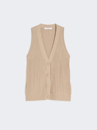DETAILS Single-breasted gilet featuring a combination of rib knits that accentuate the silhouette. Cotton and viscose crepe yarn gilet Figure-hugging V neck Sleeveless Front fastening with four visible buttons COMPOSITION AND CARE 55% cotton, 45% viscose. Hand wash cold (40°c max); do not bleach; do not tumble dry; flat drying in the shade; cool iron; professionally dry clean perchloroethylene - mild process; do not wet clean.; iron with a cloth between.; using neutral detergent. Distributed by Max Mara S.r.l., registered office in Reggio Emilia (Italy), Via Giulia Maramotti 4, 42124 (IT)