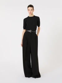 DETAILS Long trousers with a relaxed silhouette and wide leg. Compact cady trousers Loose fit with front darts Fastening with a wide waistband tab, zip fly and small hook Side inset pockets Trouser crease and darts sewn at the waist back COMPOSITION AND CARE 65% triacetate, 35% polyester. Machine wash cold delicate cycle; do not bleach; do not tumble dry; line drying in the shade; cool iron; professionally dry clean perchloroethylene - mild process.; protect buttons before washing. Distributed by Max Mara S.r.l., registered office in Reggio Emilia (Italy), Via Giulia Maramotti 4, 42124 (IT)