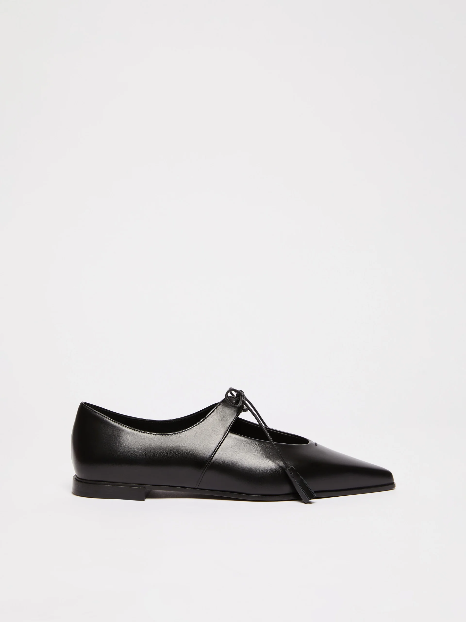 DETAILS Flat ballerinas featuring a tapered tip design and lace-up straps on the instep. - Smooth low-sheen calfskin ballerinas - Nappa-leather lining - Round top line and customised label on the insole - Tubular laces with tassels and hand-sewn stitch - Insole with lightly padded cushioning at the toe - 1 cm heel and leather sole with non-slip Monogram logo COMPOSITION AND CARE Upper in calf; lining in lamb leather; sole in leather. Distributed by Max Mara S.r.l., registered office in Reggio Emilia (Italy), Via Giulia Maramotti 4, 42124 (IT)