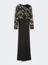 DETAILS Long dress that enhances the silhouette with a sophisticated combination of materials. The bodice stands out with a refined floral pattern embroidered with sequins on a tulle base. Dress in shiny washed crepe enver satin fabric Sheath silhouette with darted waist Crew neckline featuring geometric tulle insert Long sleeves with zip at cuffs, creating glove-like effect Invisible zip fastening at the back Fully lined model COMPOSITION AND CARE Upper part 100% polyester; joining thread 100% polyester; - exclusive of decoration; lower part 71% acetate, 29% viscose; lining 85% acetate, 10% silk, 5% polyamide; sleeves lining 100% polyamide. Do not wash; do not bleach; do not tumble dry; cool iron; professionally dry clean perchloroethylene - mild process; do not wet clean.; wash the garment while it is fastened.; do not iron the paillettes.; turn the articles inside out before washing. Distributed by Max Mara S.r.l., registered office in Reggio Emilia (Italy), Via Giulia Maramotti 4, 42124 (IT)