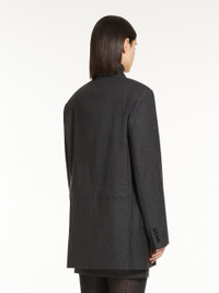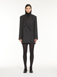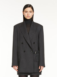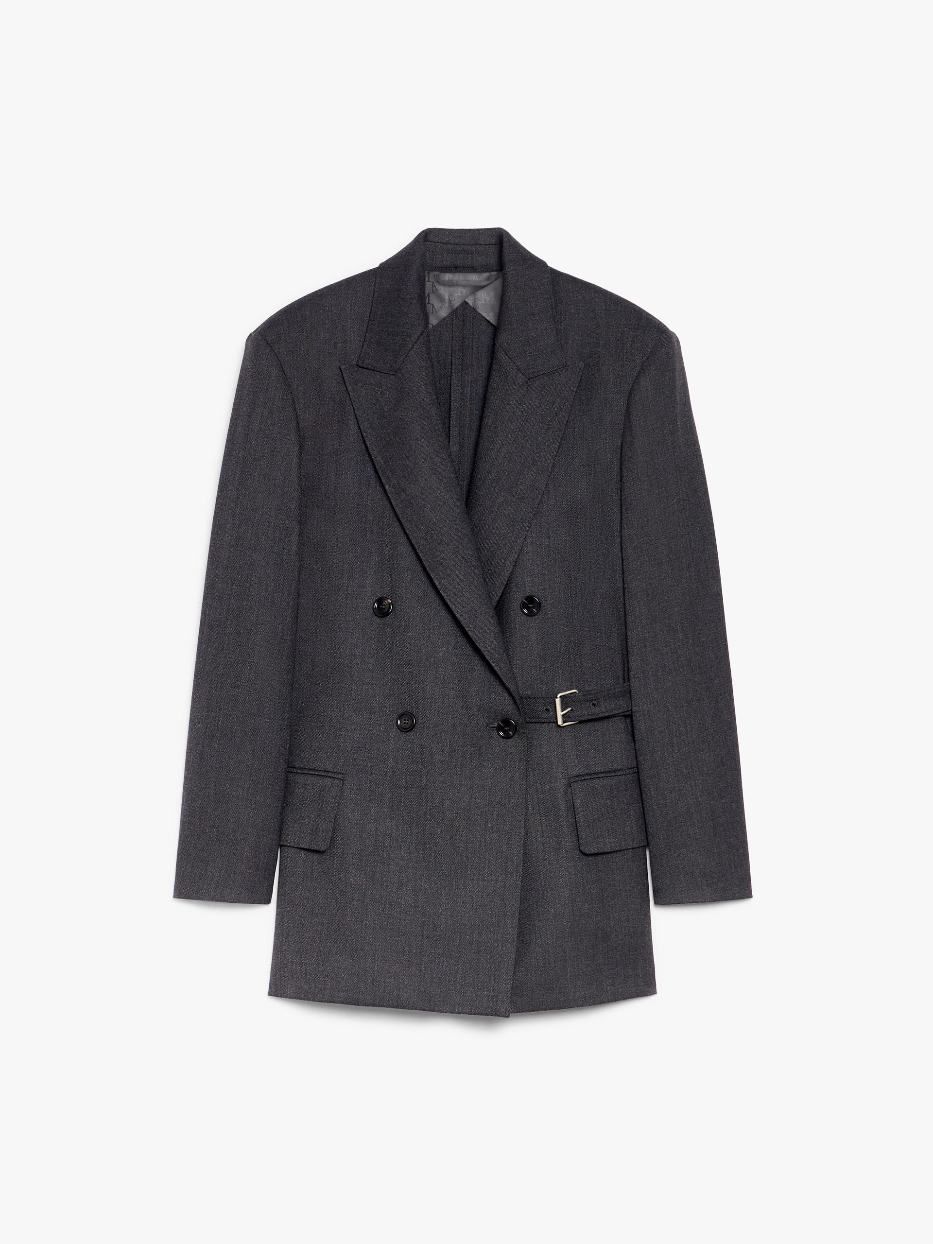 DETAILS Straight double-breasted blazer made of heavy gabardine in pure melange wool. The oversized style features a peak lapel collar, welt pockets with flap on the front and double vent on the back. The fit can be adjusted with the belt inserted internally at the back waist and fastened on the side with a metal buckle. Front fastening with visible buttons. COMPOSITION AND CARE Fabric 100% virgin wool; lining 65% acetate, 35% polyester. Do not wash; do not bleach; do not tumble dry; cool iron; professionally dry clean perchloroethylene - mild process; do not wet clean.; do not iron the buttons.; protect buttons before washing.; protect the buckle before washing.; contains non-textile parts of animal origin. Distributed by Max Mara S.r.l., registered office in Reggio Emilia (Italy), Via Giulia Maramotti 4, 42124 (IT)