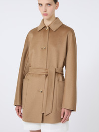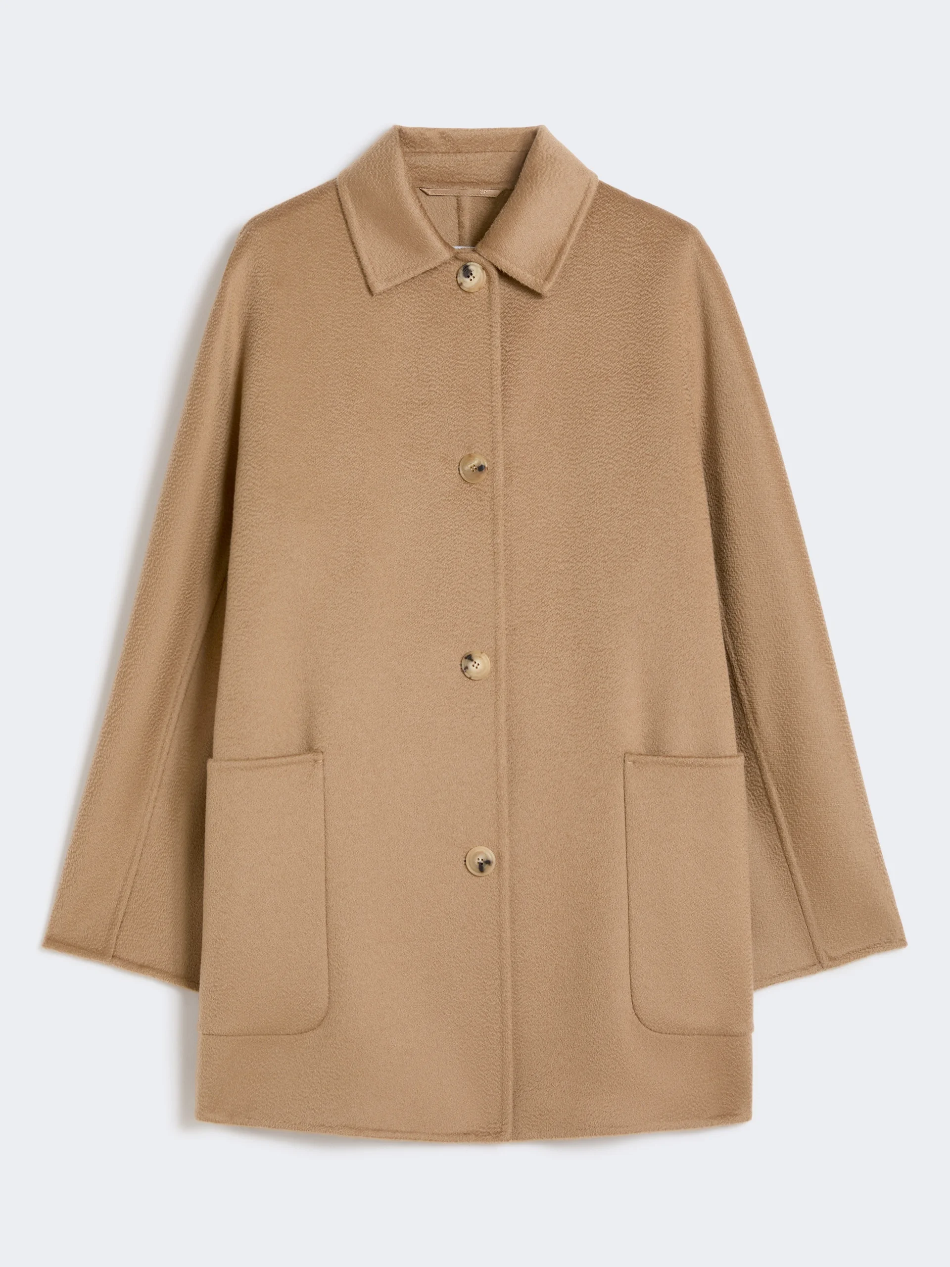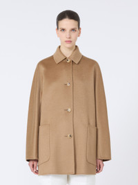 DETAILS Short, straight-cut coat. Coat in hand-stitched pure cashmere zibeline double-face drap Shirt collar Long kimono sleeves Single-breasted closure with visible buttons Pockets at the front Unlined COMPOSITION AND CARE Fabric 100% cashmere; - except joining thread. Do not wash; do not bleach; do not tumble dry; cool iron; professionally dry clean perchloroethylene - mild process; do not wet clean.; do not iron the buttons.; protect buttons before washing.; contains non-textile parts of animal origin. Distributed by Max Mara S.r.l., registered office in Reggio Emilia (Italy), Via Giulia Maramotti 4, 42124 (IT)