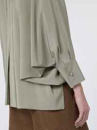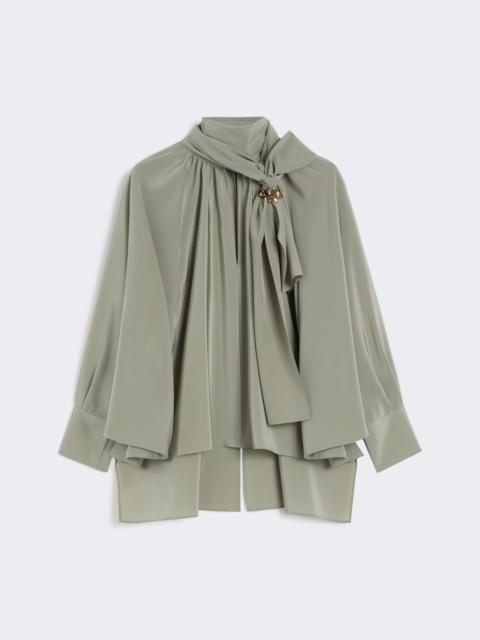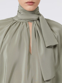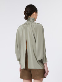 DETAILS Blouse with loose, feminine volumes and wide raglan batwing sleeves. Pure silk crepe de Chine blouse V-neck and foulard collar that ties in a bow Deep cuffs with covered side button Seam motif at the centre back Removable metallic jewel loop Asymmetrical hem that is longer at the back COMPOSITION AND CARE 100% silk. Do not wash; do not bleach; do not tumble dry; cool iron; professionally dry clean perchloroethylene - mild process; do not wet clean.; do not iron the buttons.; protect buttons before washing.; turn the articles inside out before washing.; remove metal parts before washing. Distributed by Max Mara S.r.l., registered office in Reggio Emilia (Italy), Via Giulia Maramotti 4, 42124 (IT)