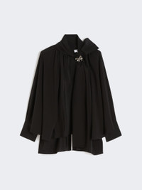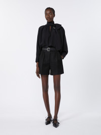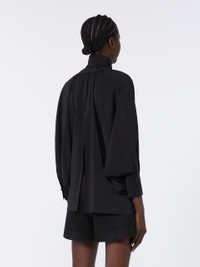 DETAILS Blouse with loose, feminine volumes and wide raglan batwing sleeves. - Pure silk crepe de Chine blouse - V-neck and foulard collar that ties in a bow - Deep cuffs with covered side button - Seam motif at the centre back - Removable metallic jewel loop - Asymmetrical hem that is longer at the back COMPOSITION AND CARE 100% silk. Do not wash; do not bleach; do not tumble dry; cool iron; professionally dry clean perchloroethylene - mild process; do not wet clean.; do not iron the buttons.; protect buttons before washing.; turn the articles inside out before washing.; remove metal parts before washing. Distributed by Max Mara S.r.l., registered office in Reggio Emilia (Italy), Via Giulia Maramotti 4, 42124 (IT)