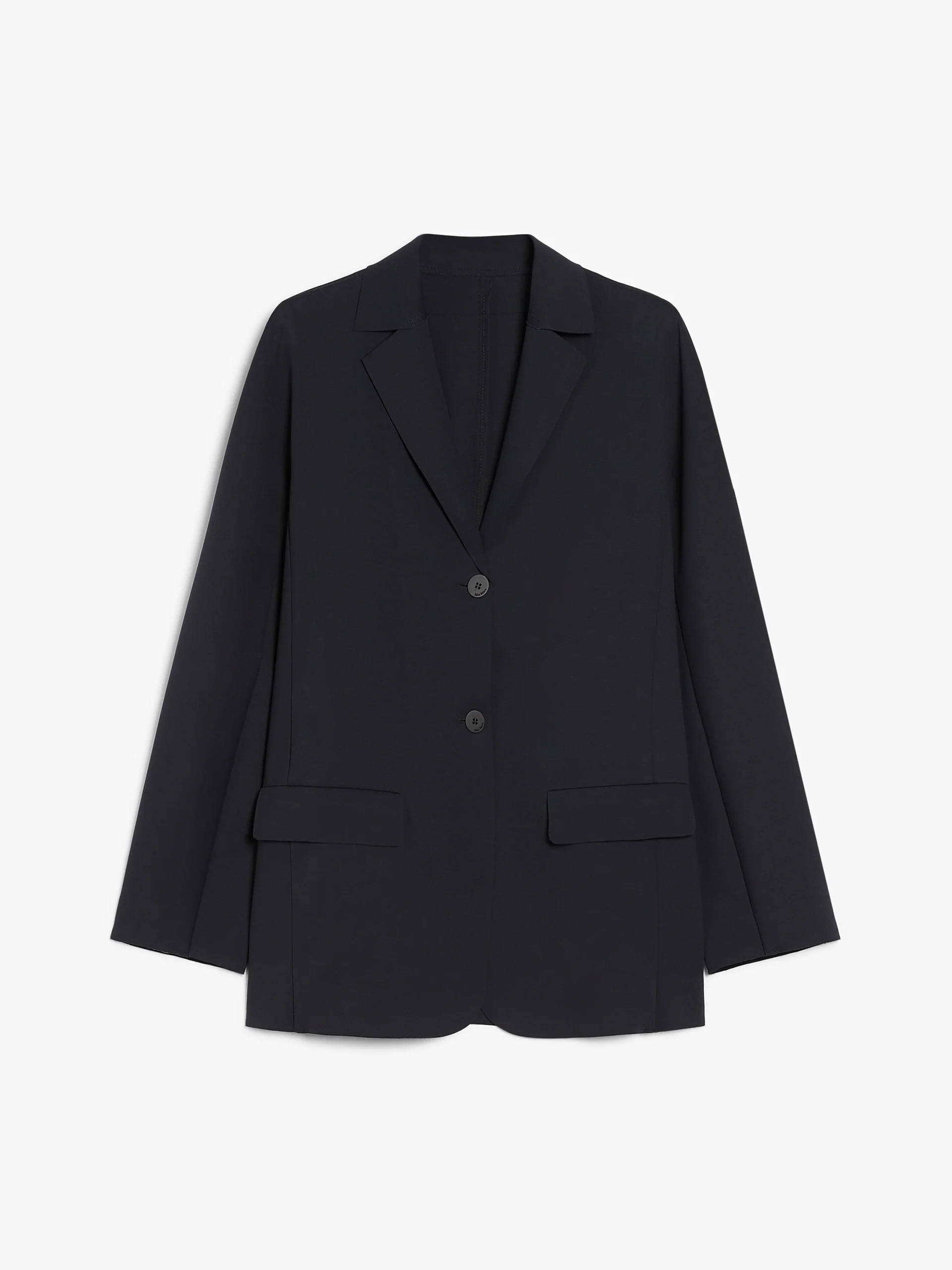 DETAILS Single-breasted deconstructed blazer in soft technical cotton jersey fabric featuring a lapel collar, long kimono sleeves and flap-adorned welt front pockets. The unlined model boasts a straight fit, central rear vent, ribbon internal trims and raw-cut heat-sealed details. Visible two-button fastening on the front. COMPOSITION AND CARE 52% cotton, 38% elastomultiester, 10% elastane. Hand wash cold; do not bleach; do not tumble dry; flat drying in the shade; cool iron; professionally dry clean perchloroethylene - mild process; do not wet clean.; iron with a cloth between.; using neutral detergent.; don’t rub. Distributed by Max Mara S.r.l., registered office in Reggio Emilia (Italy), Via Giulia Maramotti 4, 42124 (IT)