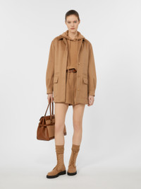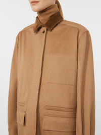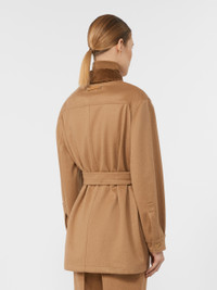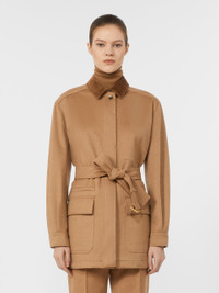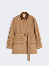 DETAILS Short jacket with workwear patch pockets on the front. Lightweight, water-repellent baby camel drap jacket Straight lines and a matching belt with pull buckle 12-wale cotton corduroy shirt collar Set-in sleeves with cuff and side button Concealed front fastening Inside left pocket Leather logo loop on the back of the neck COMPOSITION AND CARE Outer fabric 100% camelwool; inner fabric 77% polyamide, 23% elastane; lining 65% acetate, 35% polyester. Do not wash; do not bleach; do not tumble dry; cool iron; professionally dry clean perchloroethylene - mild process; do not wet clean.; wash the garment while it is fastened.; do not iron the real leather details.; do not iron the buttons.; protect buttons before washing.; turn the articles inside out before washing.; remove the buckle before washing.; contains non-textile parts of animal origin. Distributed by Max Mara S.r.l., registered office in Reggio Emilia (Italy), Via Giulia Maramotti 4, 42124 (IT)