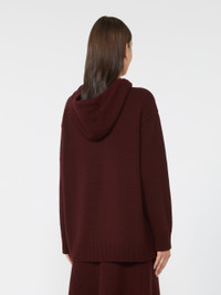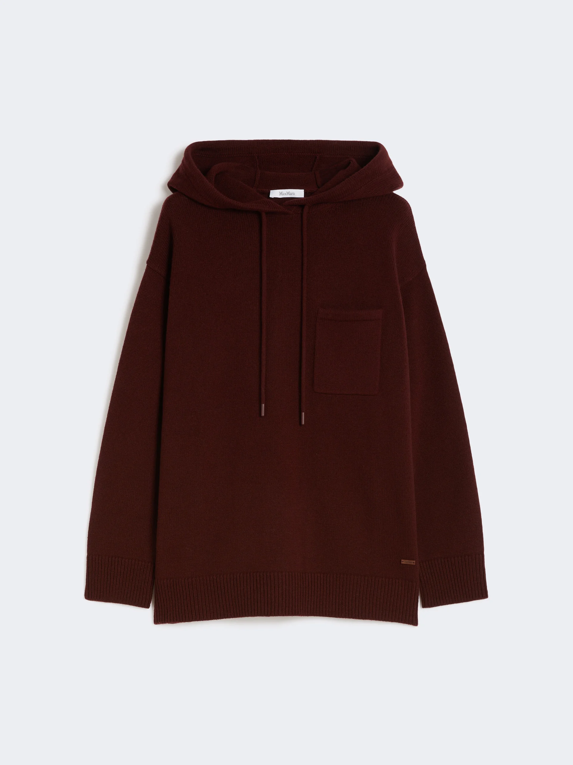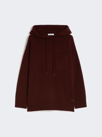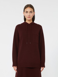 DETAILS Hooded sweatshirt with drawstring and tone-on-tone enamelled metal ends. Wool and cashmere plain-knit sweatshirt Long sleeves with dropped shoulders Chest patch pocket, left side as worn Ribbed cuffs and hem Logo plate at the front hem COMPOSITION AND CARE 70% wool, 30% cashmere. Hand wash cold (40°c max); do not bleach; do not tumble dry; flat drying in the shade; cool iron; professionally dry clean perchloroethylene - mild process; do not wet clean.; iron with a cloth between.; using neutral detergent. Distributed by Max Mara S.r.l., registered office in Reggio Emilia (Italy), Via Giulia Maramotti 4, 42124 (IT)