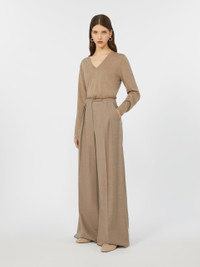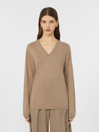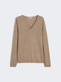 DETAILS Basic jumper featuring a seamless construction, ideal worn under a jacket. Featherlight, pure cashmere plain-knit jumper Regular fit V neck Long set-in sleeves Straight hem Ribbed edges COMPOSITION AND CARE Knitted fabric 100% cashmere; joining thread except joining thread. Hand wash cold (40°c max); do not bleach; do not tumble dry; flat drying in the shade; cool iron; professionally dry clean perchloroethylene - mild process; do not wet clean.; using neutral detergent.; iron with a cloth between. Distributed by Max Mara S.r.l., registered office in Reggio Emilia (Italy), Via Giulia Maramotti 4, 42124 (IT)