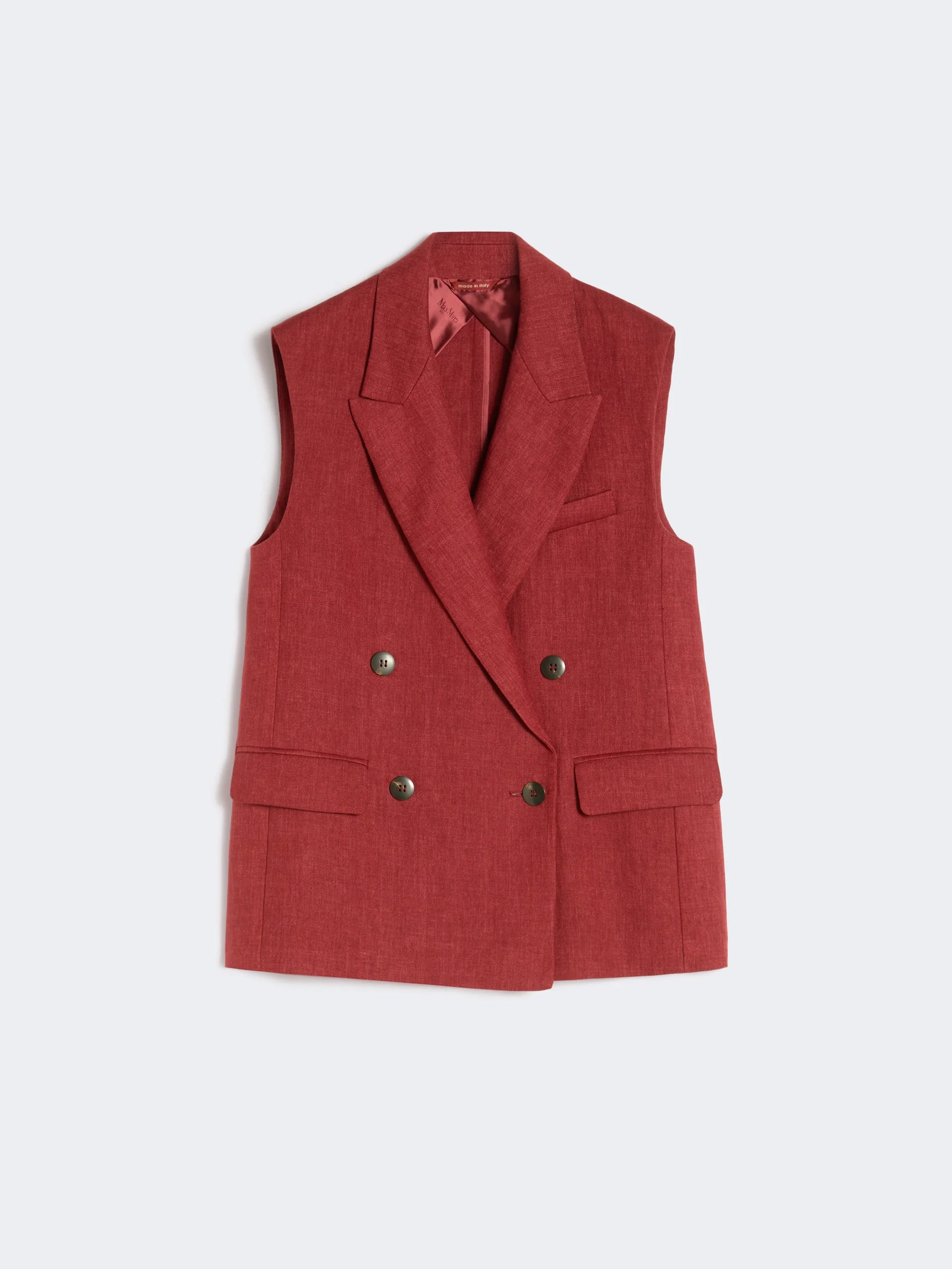 DETAILS Tailored-style double-breasted gilet. - Faded pure linen twill gilet - Straight fit - Peak-lapel collar - Button fastening - Breast pocket and flap welt pockets - Semi-lined - Central slit at the back COMPOSITION AND CARE Fabric 100% flaxlinen; lining 58% viscose, 42% cupro. Do not wash; do not bleach; do not tumble dry; cool iron; professionally dry clean perchloroethylene - mild process; do not wet clean.; do not iron the buttons.; contains non-textile parts of animal origin. Distributed by Max Mara S.r.l., registered office in Reggio Emilia (Italy), Via Giulia Maramotti 4, 42124 (IT) Collection: Studio Product code: 6281016206035 - MSTAIA