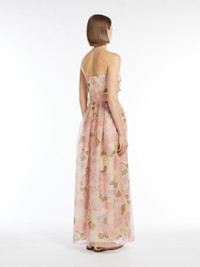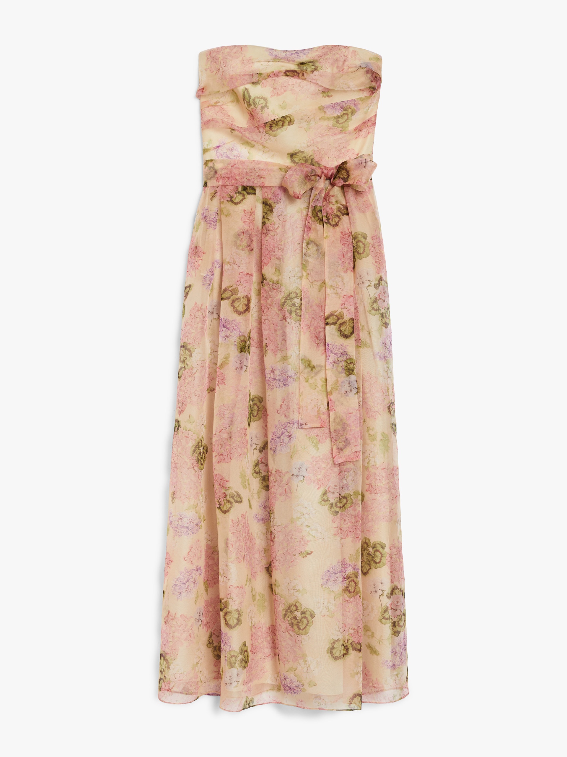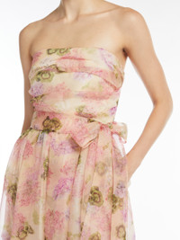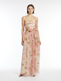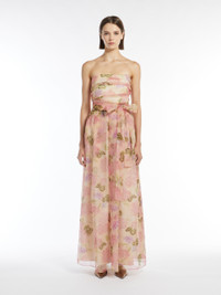 DETAILS Long bustier dress in luxurious pure silk georgette featuring an all-over printed motif. Lined style with an elegant and feminine line, featuring a draped bodice with a straight neckline, seam at the waist and full skirt. The matching belt accentuates the silhouette. Invisible zip fastening on the back. COMPOSITION AND CARE Fabric 100% silk; lining 100% cotton. Do not wash; do not bleach; do not tumble dry; cool iron; professionally dry clean perchloroethylene - mild process; do not wet clean. Distributed by Max Mara S.r.l., registered office in Reggio Emilia (Italy), Via Giulia Maramotti 4, 42124 (IT)