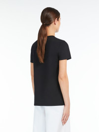 DETAILS Short-sleeved crew-neck T-shirt made of soft cotton in a solid colour. A basic, straight-cut style, embellished with a MaxMarabesque motif embroidered in lurex thread and applied on the front. COMPOSITION AND CARE Jersey fabric 100% cotton; - exclusive of embroideries. Machine wash cold delicate cycle; do not bleach; do not tumble dry; flat drying in the shade; cool iron; professionally dry clean perchloroethylene - mild process; professional wet cleaning - very mild process.; iron with a cloth between.; using neutral detergent. Distributed by Max Mara S.r.l., registered office in Reggio Emilia (Italy), Via Giulia Maramotti 4, 42124 (IT)