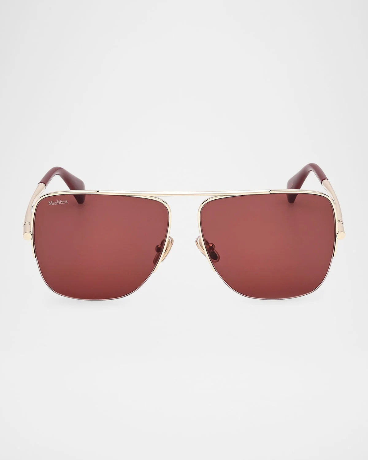 - Max Mara aviator sunglasses in metal - Eye/bridge/temple (in mm): 59-13-135 - Solid color lenses - Brow bar - Saddle nose bridge - Adjustable nose pads - Logo engraved at temple - Capped earpieces - Metal - Spot clean - 100% UVA/UVB protection - Imported - Proposition 65 warning for California residents