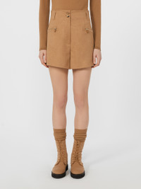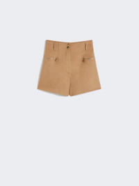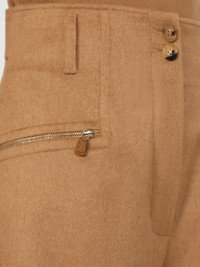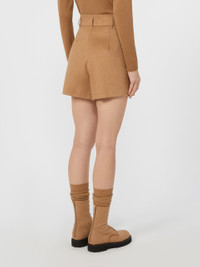 DETAILS Short, high-waisted trousers. Lightweight zibeline baby camel drap shorts Concealed zip fastening and two buttons at the waist Side pockets with visible zip Belt loops at the waist Unlined COMPOSITION AND CARE Fabric 100% camelwool; lining 95% acetate, 5% elastane. Do not wash; do not bleach; do not tumble dry; cool iron; professionally dry clean perchloroethylene - mild process; do not wet clean.; wash the garment while it is fastened.; do not iron the buttons.; protect zipper tongue and slide before cleaning.; protect buttons before washing.; turn the articles inside out before washing.; contains non-textile parts of animal origin. Distributed by Max Mara S.r.l., registered office in Reggio Emilia (Italy), Via Giulia Maramotti 4, 42124 (IT)