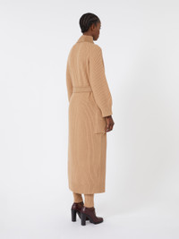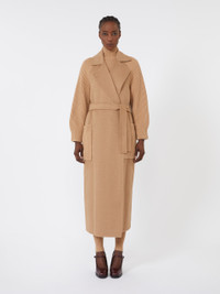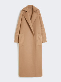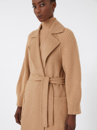 DETAILS Long wrap coat, finished with fisherman’s rib-knit wool and cashmere inserts on the sleeves, back and pockets. Hand-stitched pure camel double drap coat Straight cut Lapel collar Raglan sleeves with Lycra thread finish on the cuffs Matching belt fastening Large patch pockets at the front Unlined COMPOSITION AND CARE Fabric 100% camelwool; - except joining thread; with knitted details 70% wool, 30% cashmere. Do not wash; do not bleach; do not tumble dry; cool iron; professionally dry clean perchloroethylene - mild process; do not wet clean. Distributed by Max Mara S.r.l., registered office in Reggio Emilia (Italy), Via Giulia Maramotti 4, 42124 (IT)
